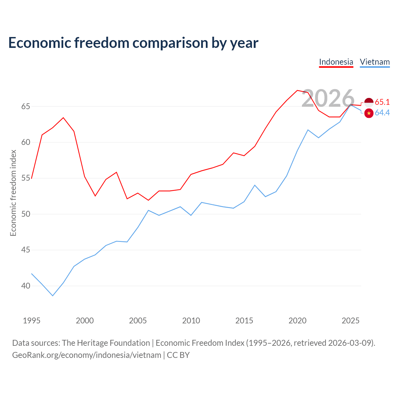 The Economic Freedom Index for Indonesia is 65.1, ranking 67/197, compared to 64.4 for Vietnam, ranking 73/197. The chart above displays a comparison of annual changes in economic freedom indexes.
