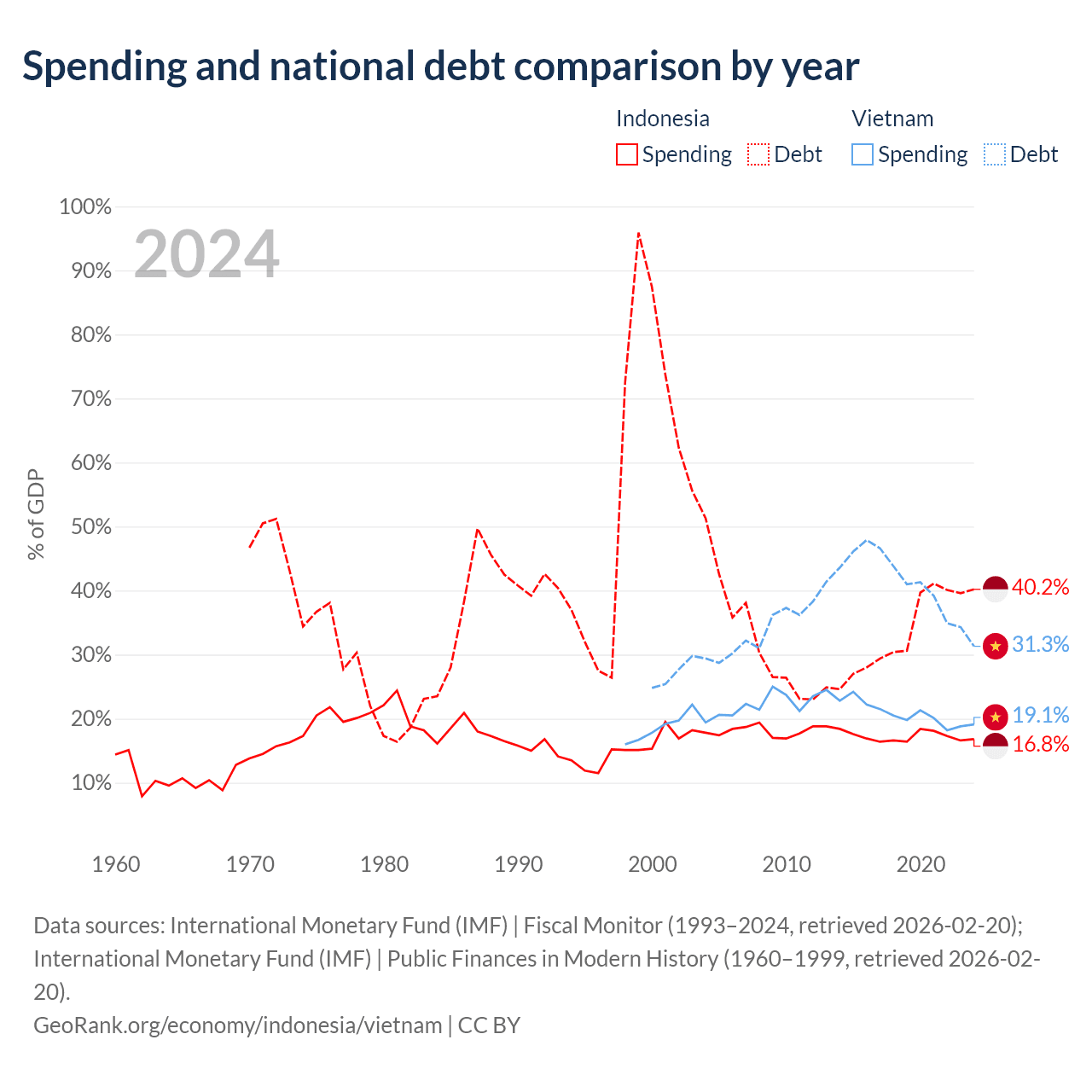 Indonesia has $561B in government debt (40.2% of GDP), compared to $149B (31.3% of GDP) in Vietnam.