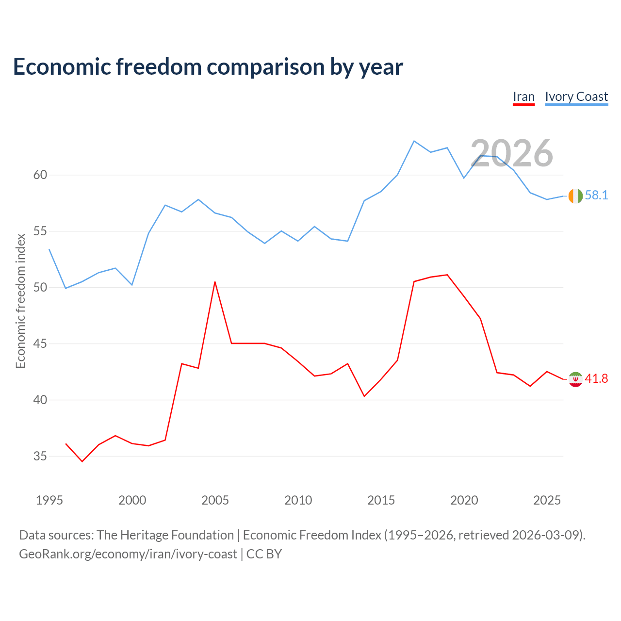 The Economic Freedom Index for Iran is 41.8, ranking 185/197, compared to 58.1 for Ivory Coast, ranking 111/197. The chart above displays a comparison of annual changes in economic freedom indexes.