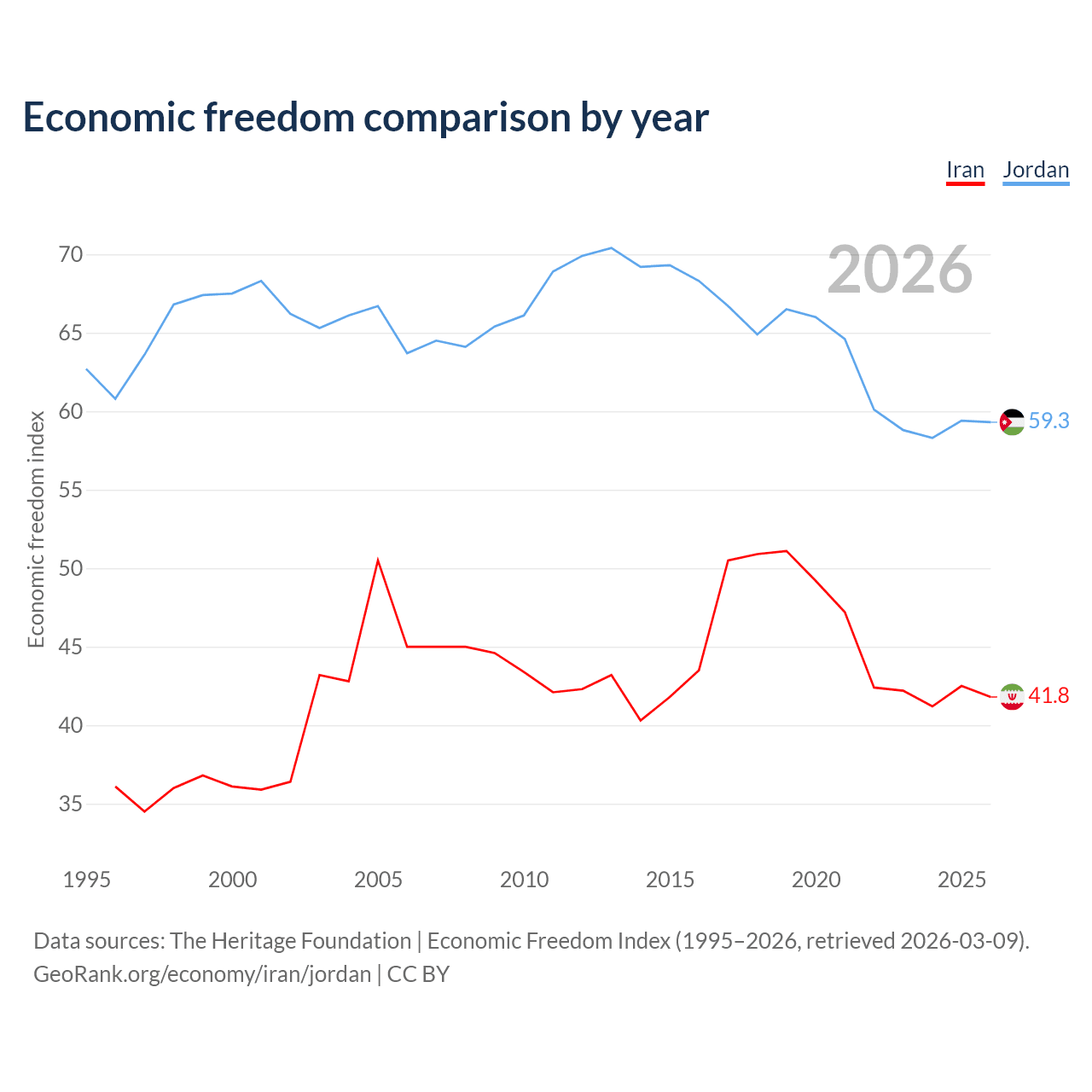 The Economic Freedom Index for Iran is 41.8, ranking 185/197, compared to 59.3 for Jordan, ranking 104/197. The chart above displays a comparison of annual changes in economic freedom indexes.