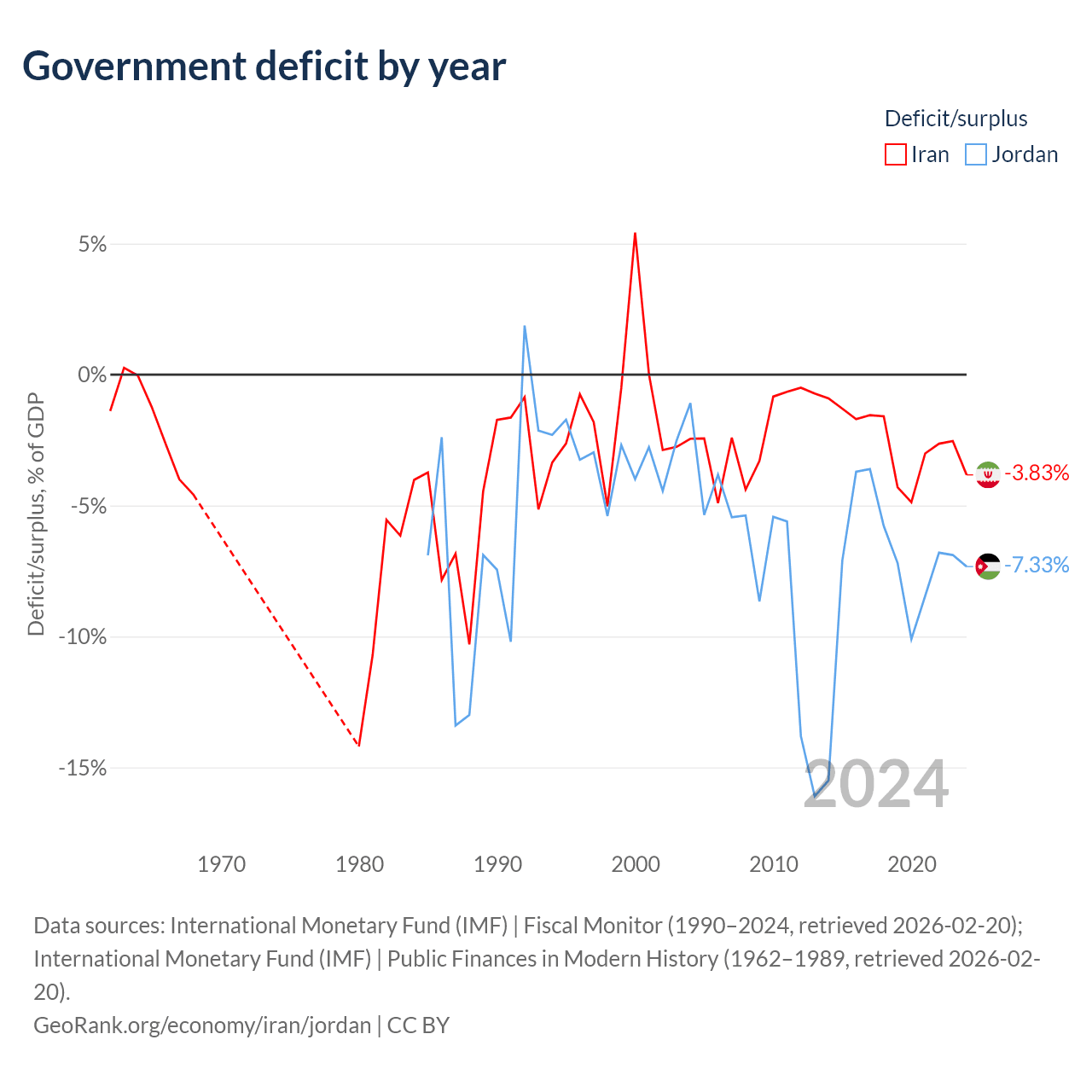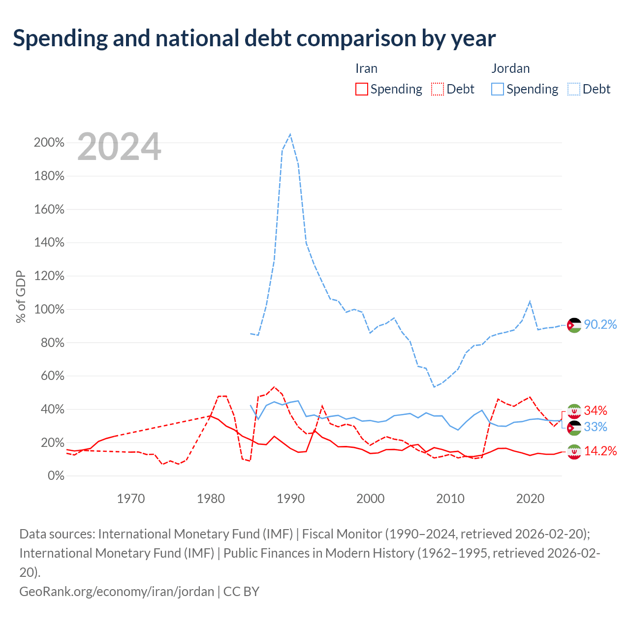 Iran has $162B in government debt (34% of GDP), compared to $48.1B (90.2% of GDP) in Jordan.