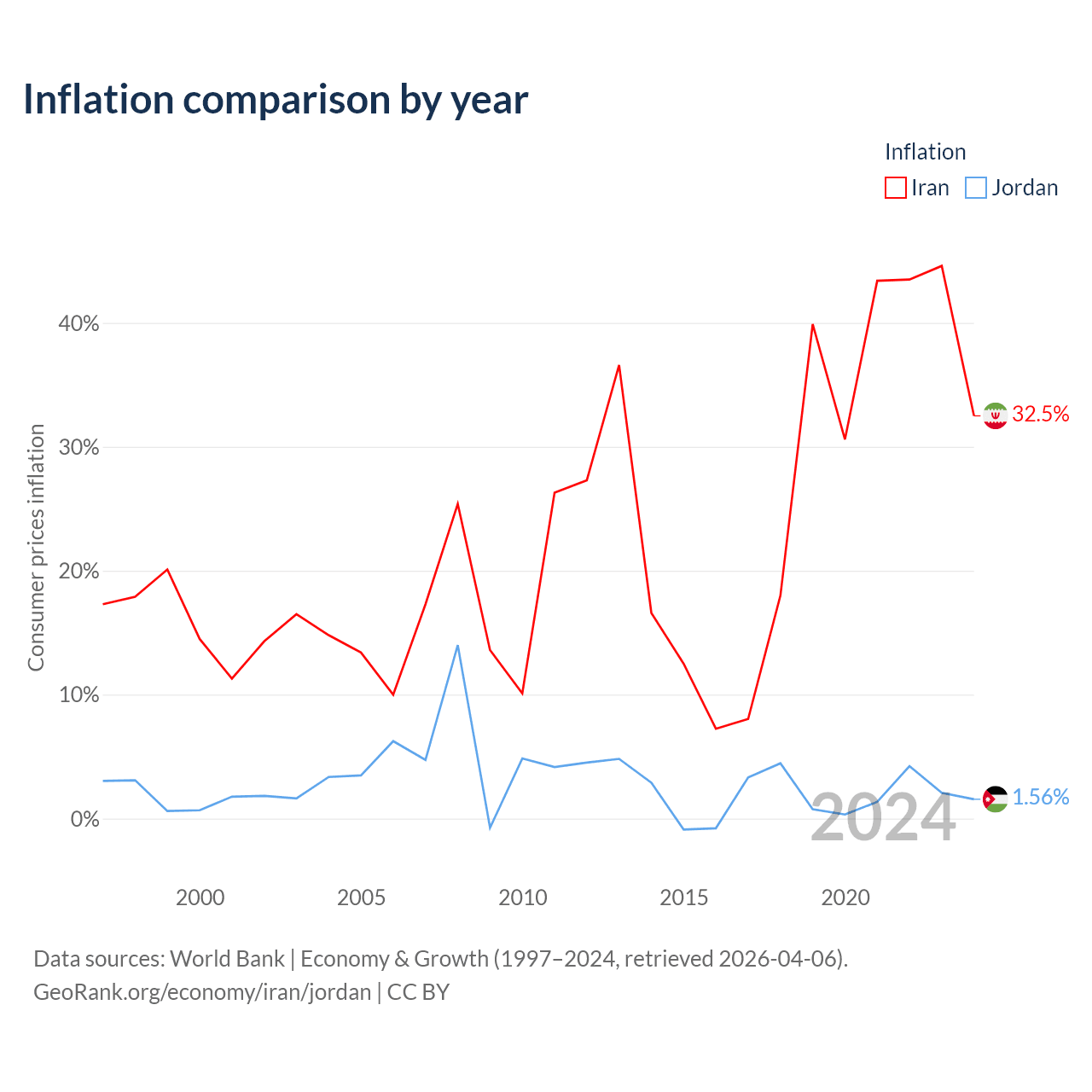 Iran has a GDP of $475B compared to $53.4B for Jordan, ranking 34/197 and 90/197 by economy size, respectively.