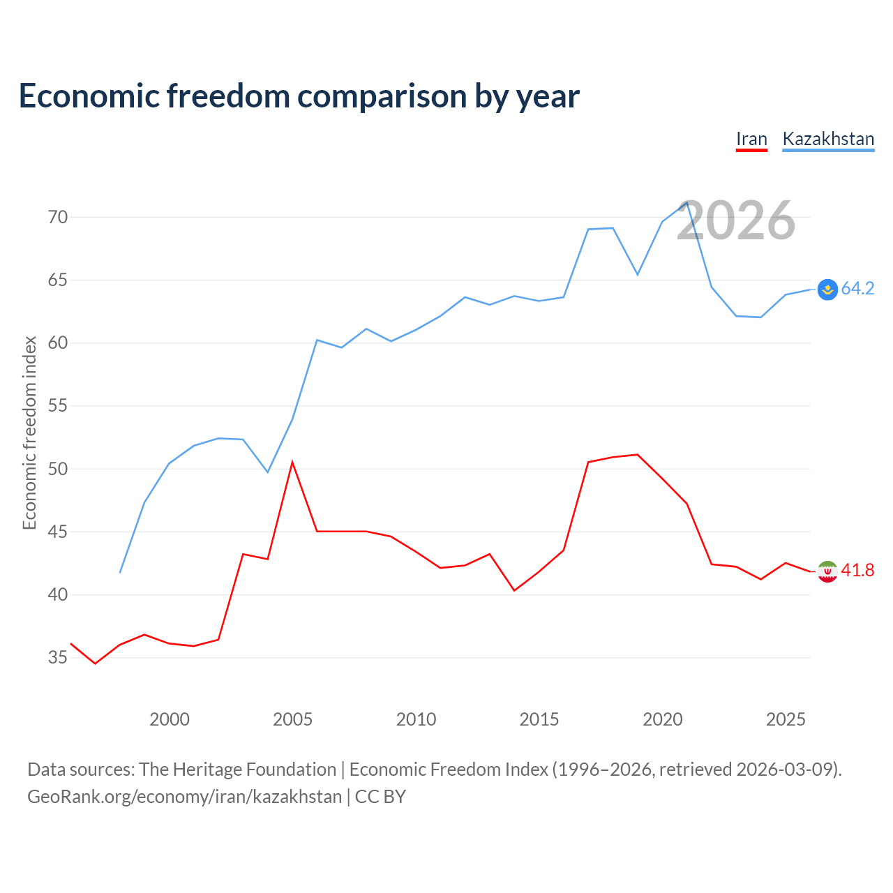The Economic Freedom Index for Iran is 41.8, ranking 185/197, compared to 64.2 for Kazakhstan, ranking 75/197. The chart above displays a comparison of annual changes in economic freedom indexes.