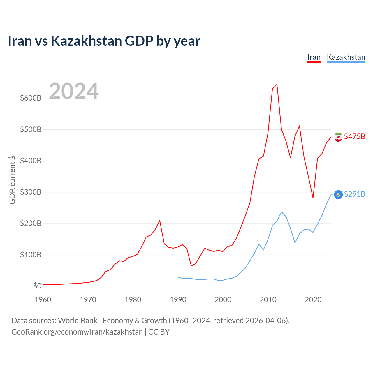 Iran has a GDP of $475B compared to $291B for Kazakhstan, ranking 34/197 and 48/197 by economy size, respectively.