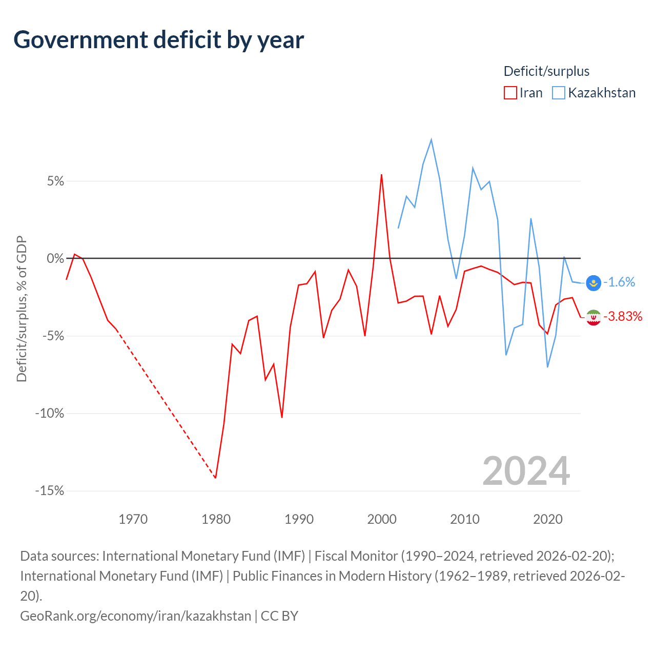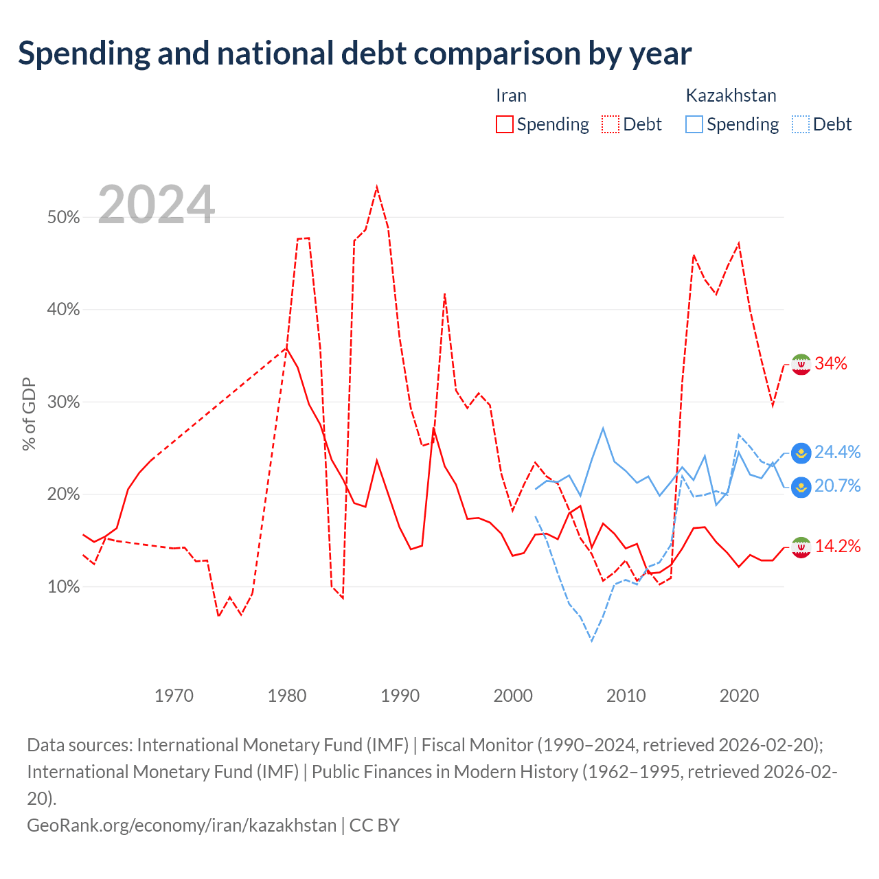 Iran has $162B in government debt (34% of GDP), compared to $71.1B (24.4% of GDP) in Kazakhstan.