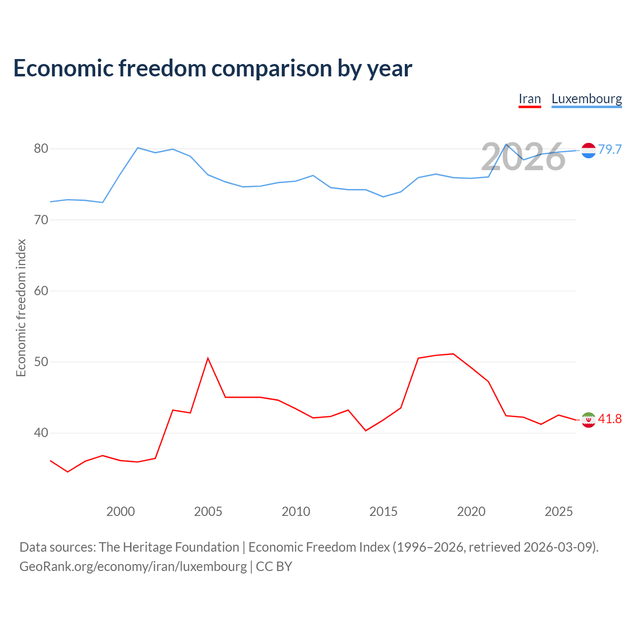 The Economic Freedom Index for Iran is 41.8, ranking 185/197, compared to 79.7 for Luxembourg, ranking 7/197. The chart above displays a comparison of annual changes in economic freedom indexes.