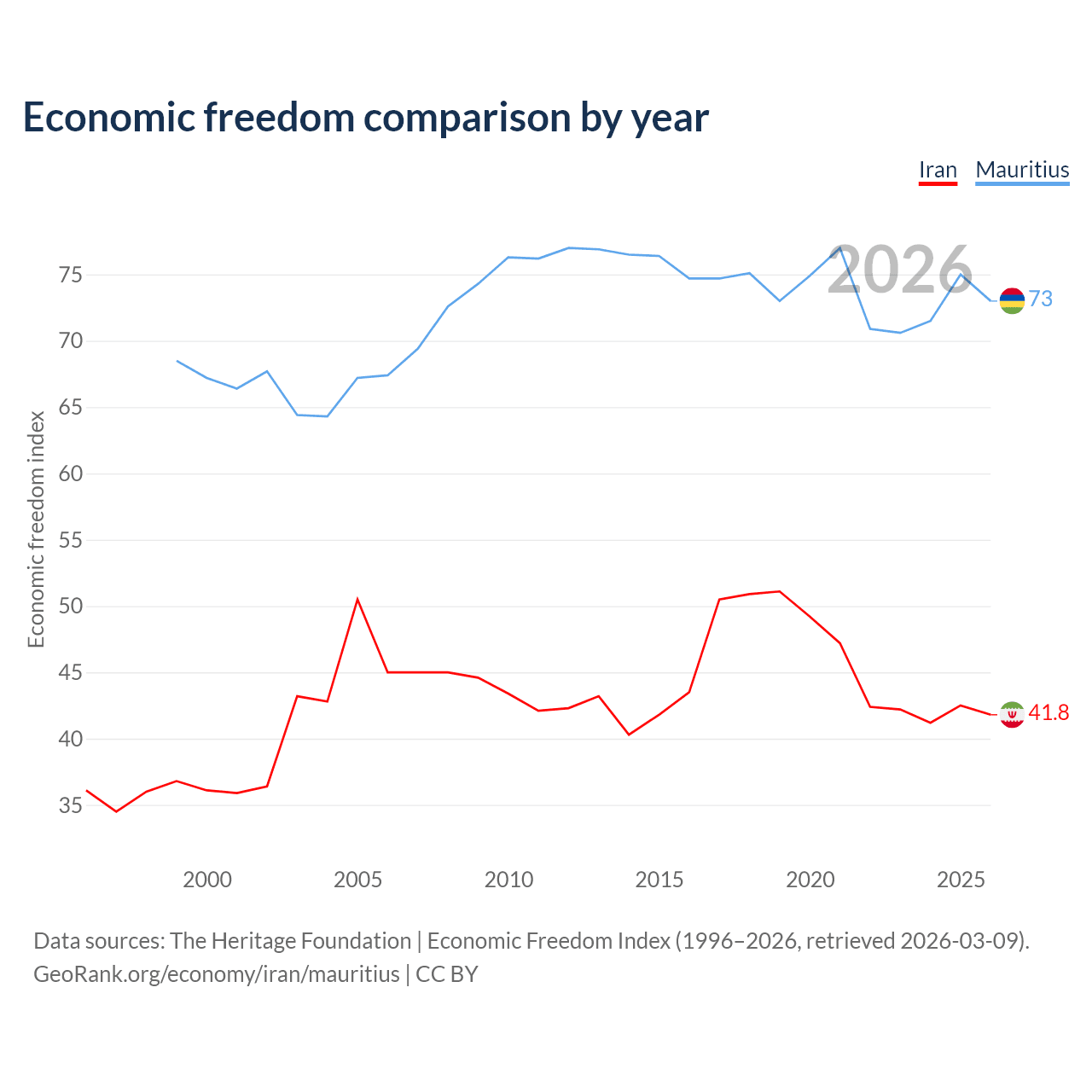 The Economic Freedom Index for Iran is 41.8, ranking 185/197, compared to 73 for Mauritius, ranking 26/197. The chart above displays a comparison of annual changes in economic freedom indexes.