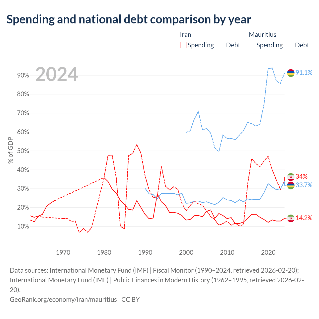 Iran has $162B in government debt (34% of GDP), compared to $13.6B (91.1% of GDP) in Mauritius.