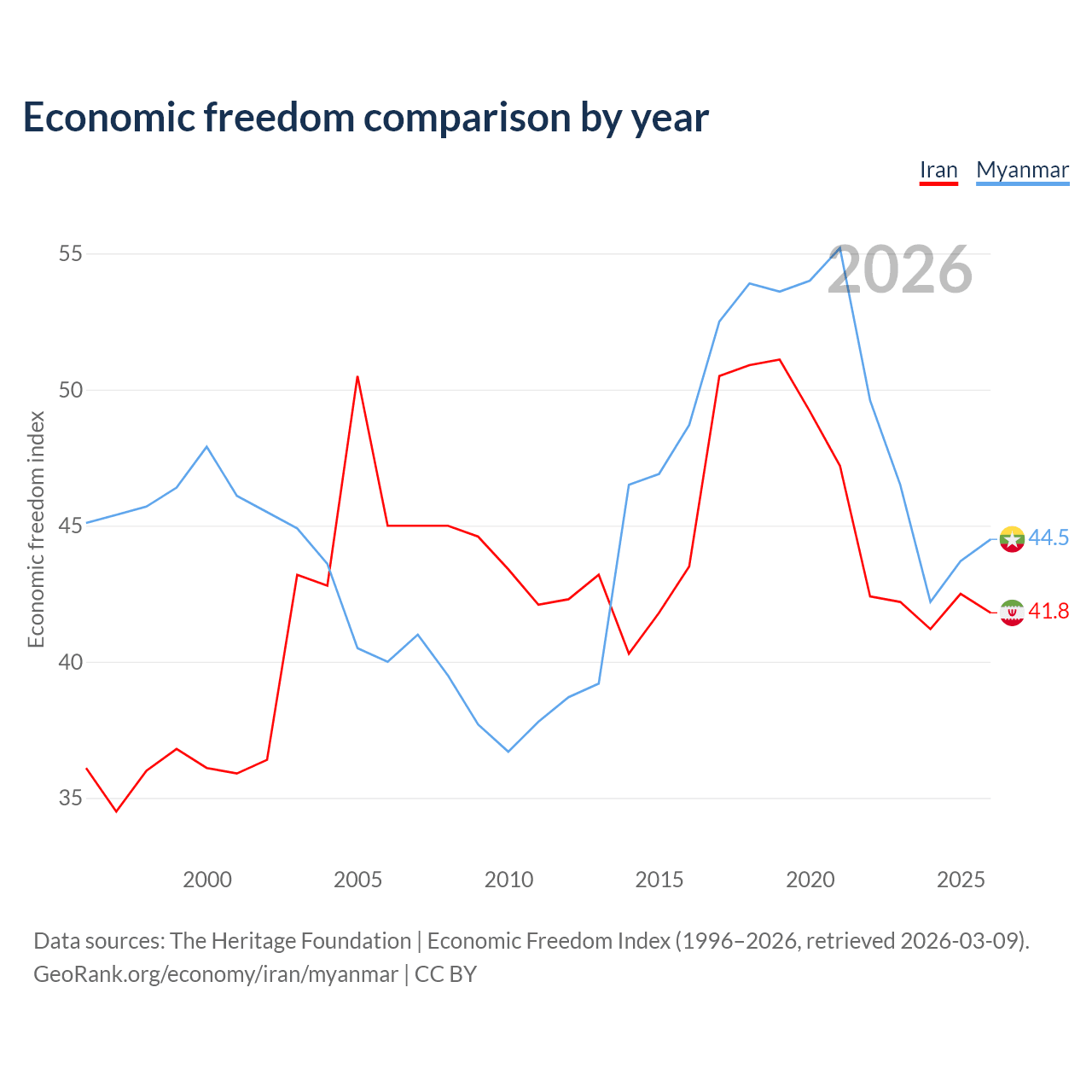 The Economic Freedom Index for Iran is 41.8, ranking 185/197, compared to 44.5 for Myanmar, ranking 180/197. The chart above displays a comparison of annual changes in economic freedom indexes.