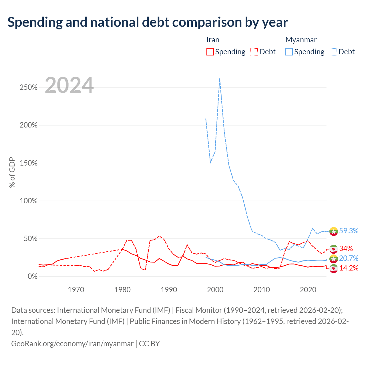 Iran has $162B in government debt (34% of GDP), compared to $44B (59.3% of GDP) in Myanmar.