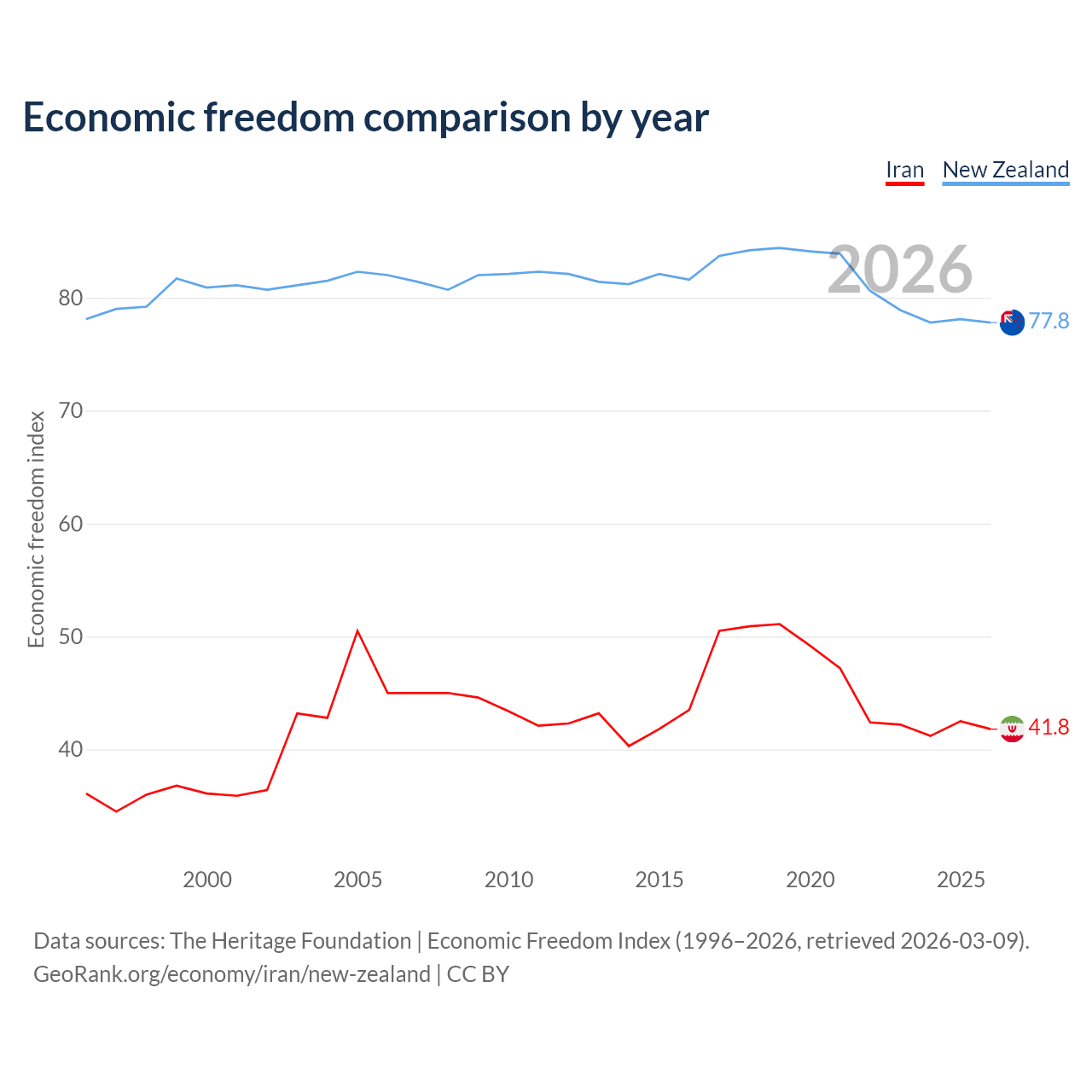 The Economic Freedom Index for Iran is 41.8, ranking 185/197, compared to 77.8 for New Zealand, ranking 13/197. The chart above displays a comparison of annual changes in economic freedom indexes.