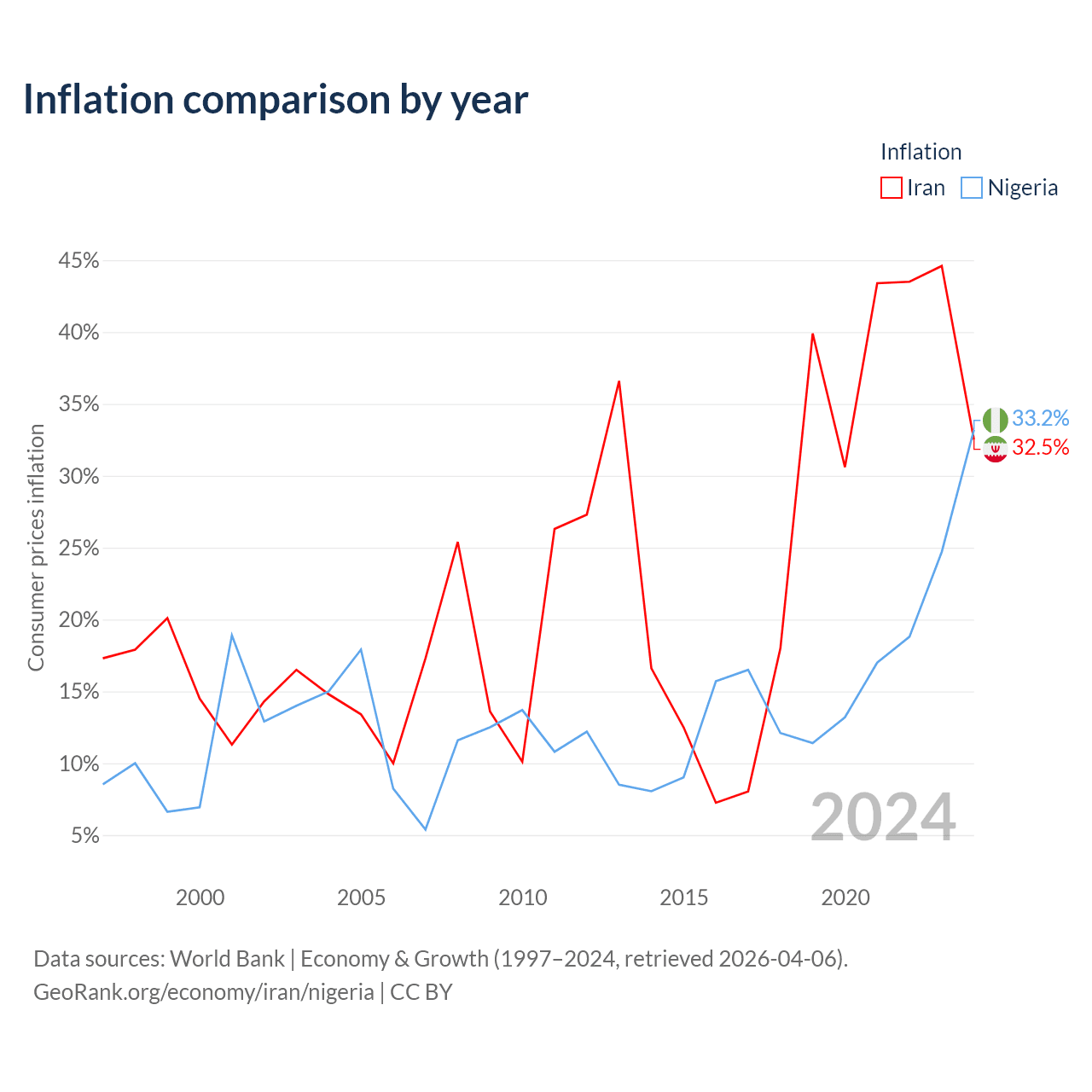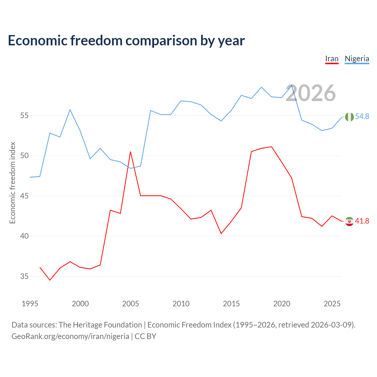 The Economic Freedom Index for Iran is 41.8, ranking 185/197, compared to 54.8 for Nigeria, ranking 132/197. The chart above displays a comparison of annual changes in economic freedom indexes.