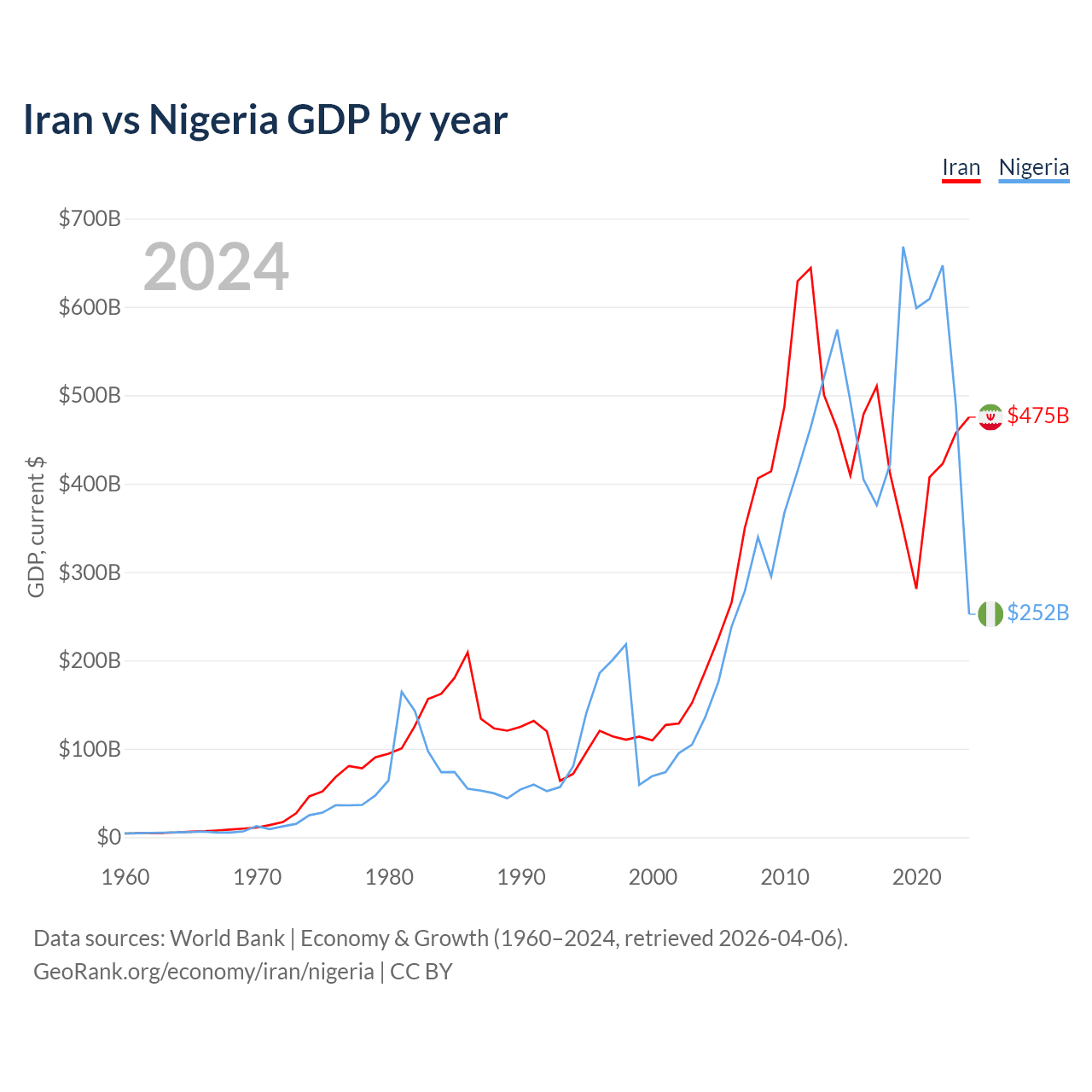 Iran has a GDP of $475B compared to $252B for Nigeria, ranking 34/197 and 54/197 by economy size, respectively.