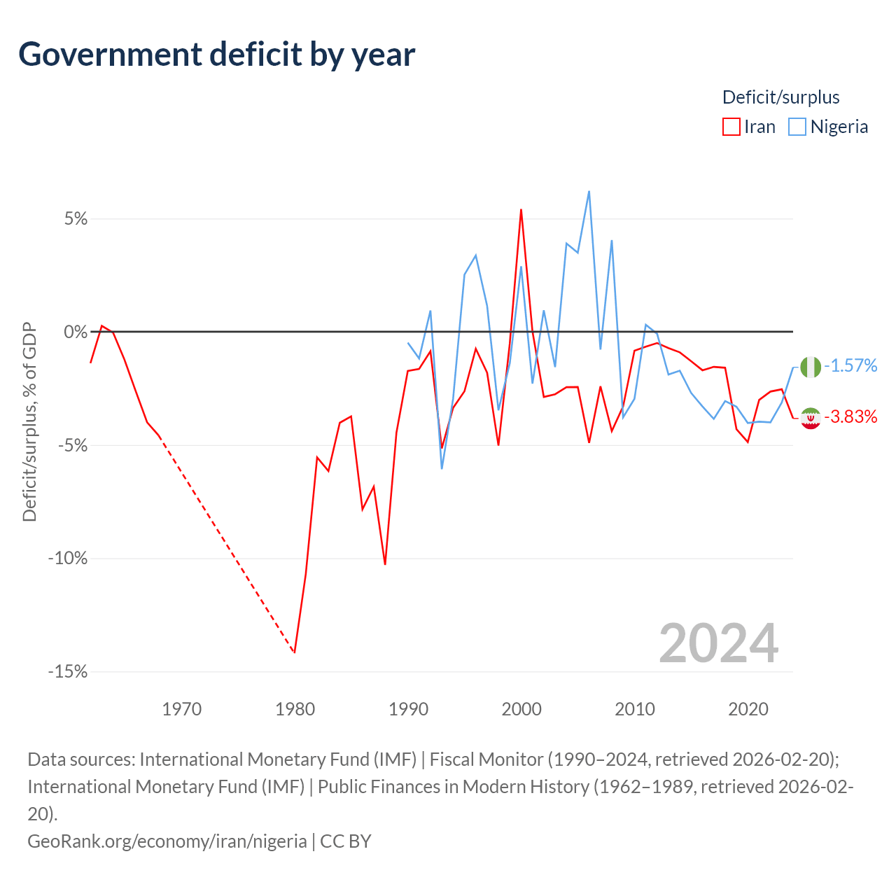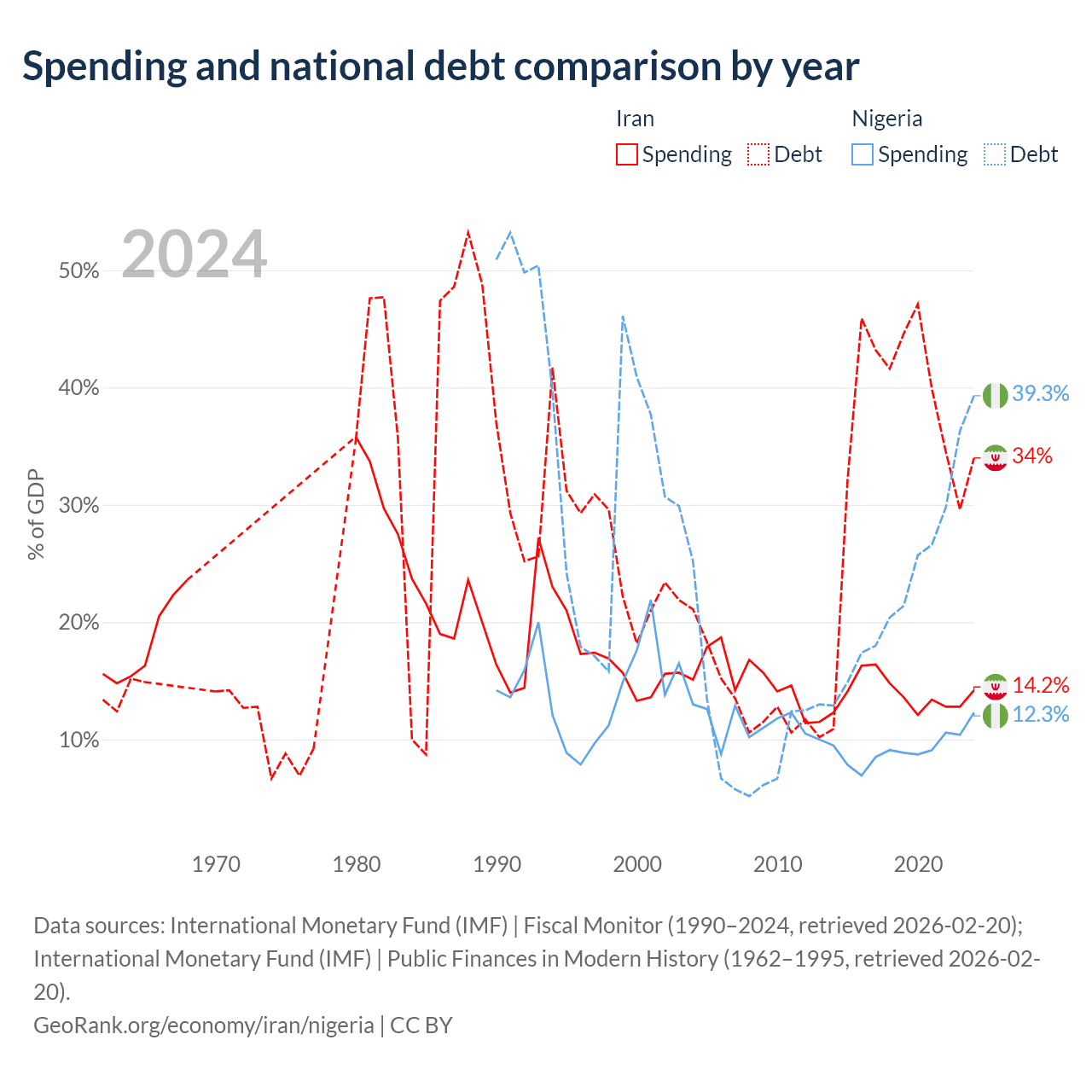 Iran has $162B in government debt (34% of GDP), compared to $99.2B (39.3% of GDP) in Nigeria.
