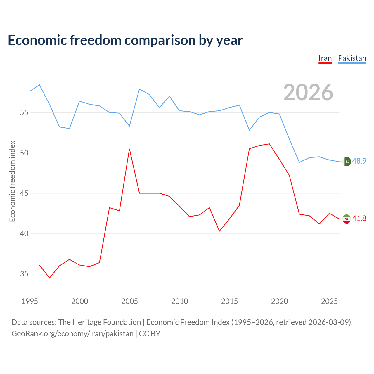 Data sources: The Heritage Foundation | Economic Freedom Index (1995–2026, retrieved 2026-03-09).