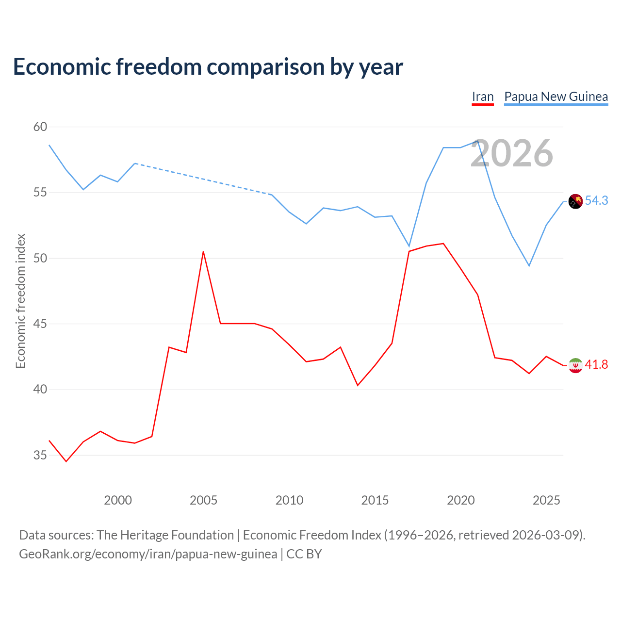 The Economic Freedom Index for Iran is 41.8, ranking 185/197, compared to 54.3 for Papua New Guinea, ranking 134/197. The chart above displays a comparison of annual changes in economic freedom indexes.