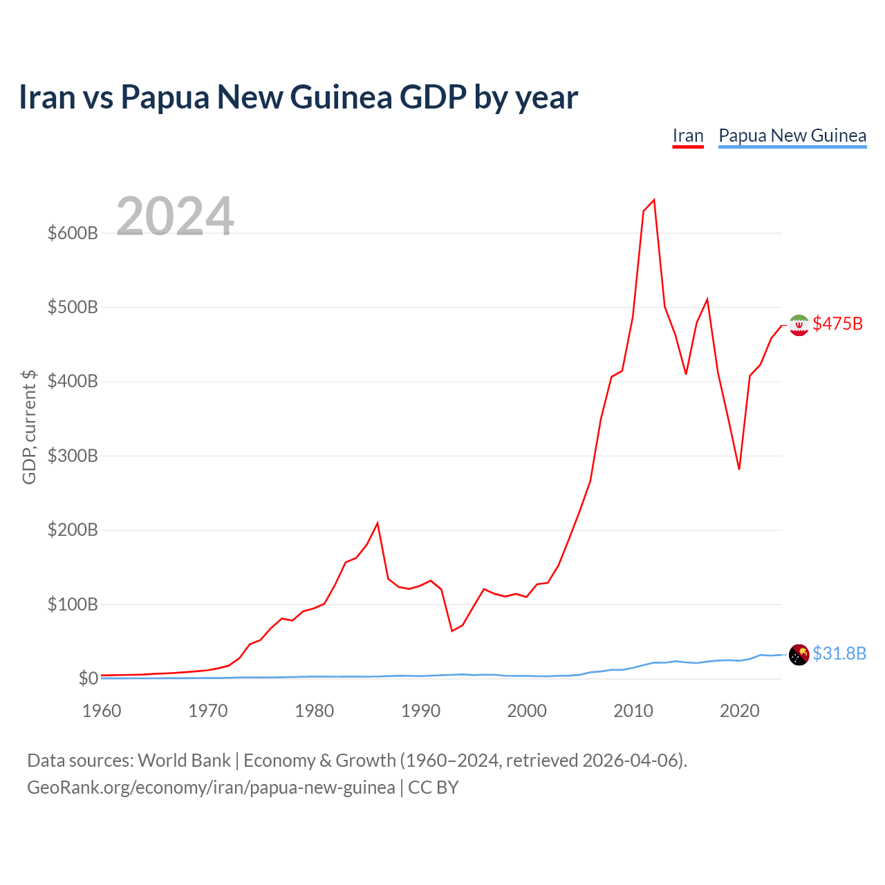 Iran has a GDP of $475B compared to $31.8B for Papua New Guinea, ranking 34/197 and 110/197 by economy size, respectively.