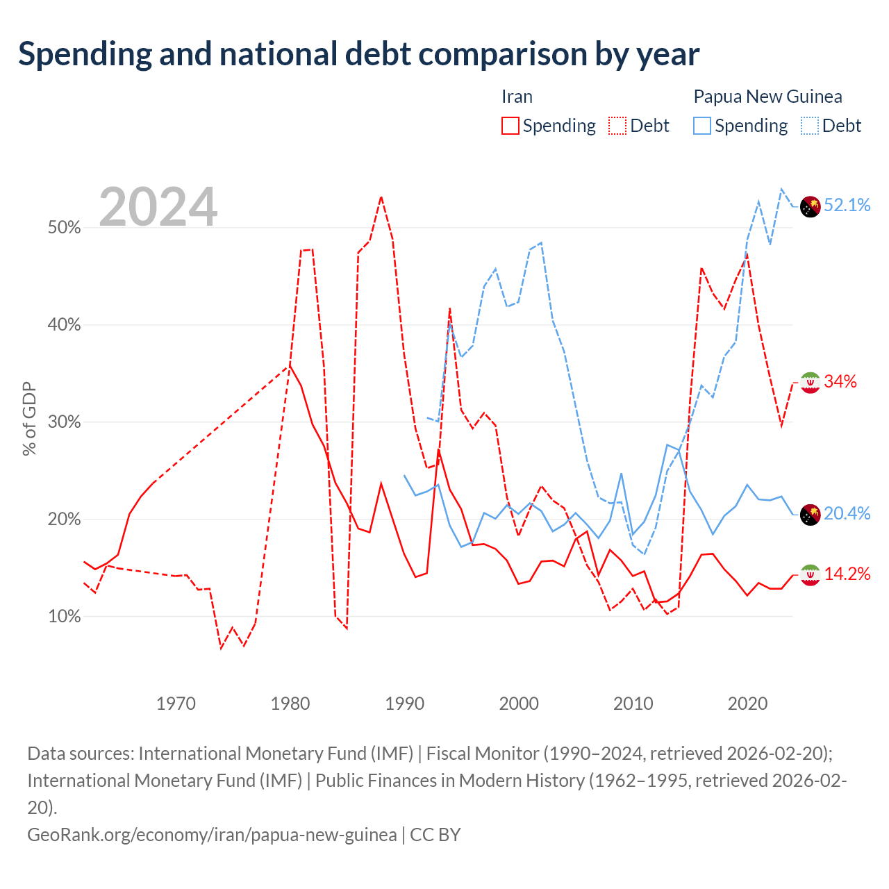 Iran has $162B in government debt (34% of GDP), compared to $16.6B (52.1% of GDP) in Papua New Guinea.