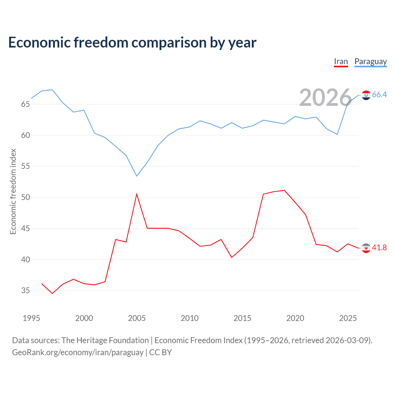 The Economic Freedom Index for Iran is 41.8, ranking 185/197, compared to 66.4 for Paraguay, ranking 61/197. The chart above displays a comparison of annual changes in economic freedom indexes.