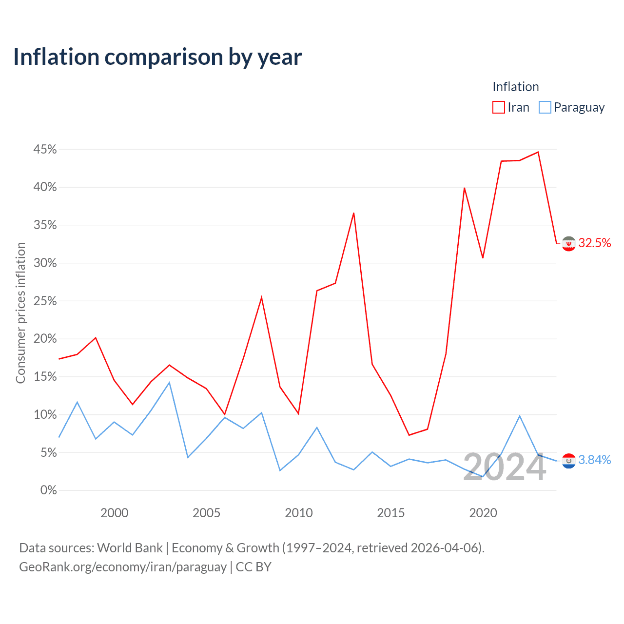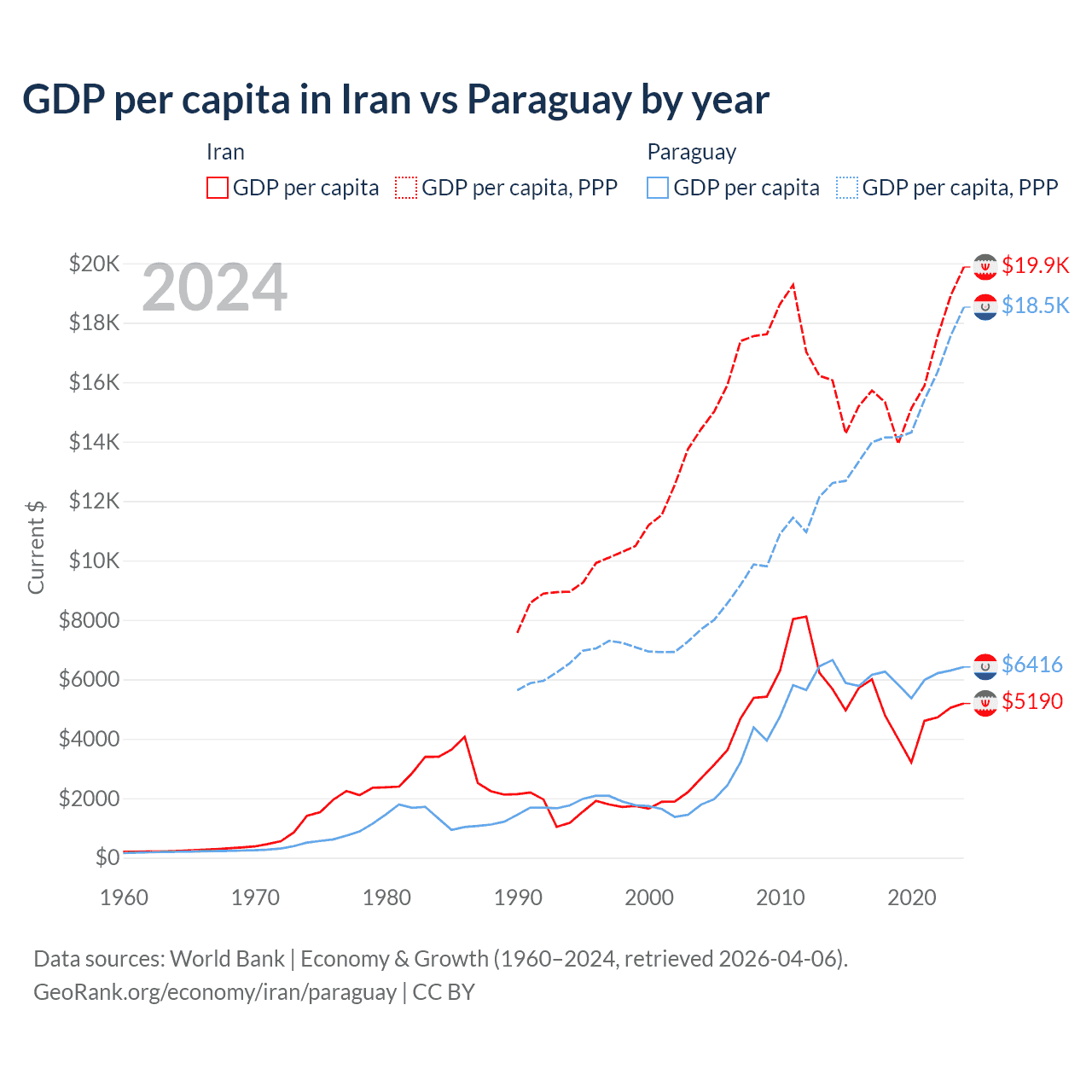 Iran has a GDP of $475B compared to $44.5B for Paraguay, ranking 34/197 and 98/197 by economy size, respectively.