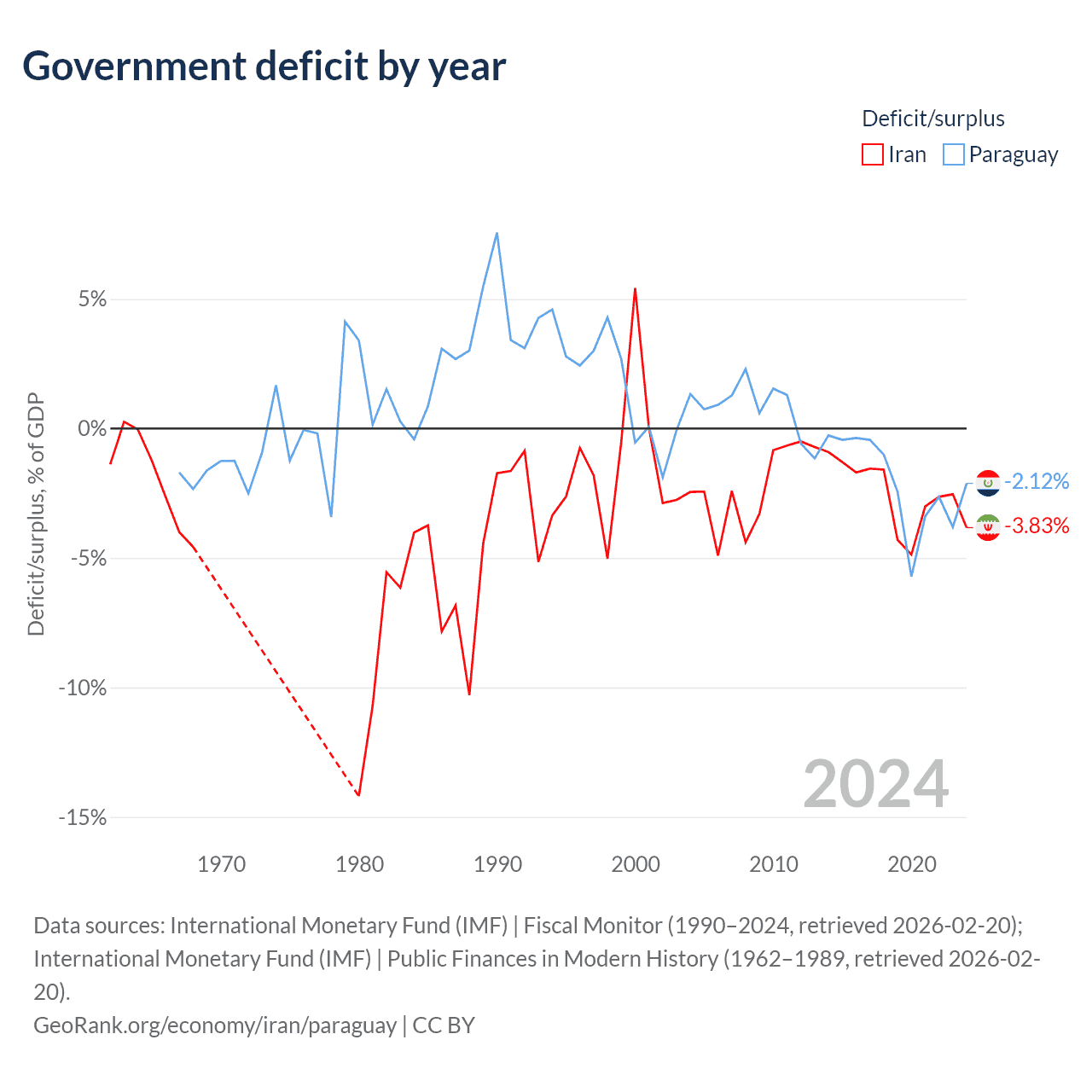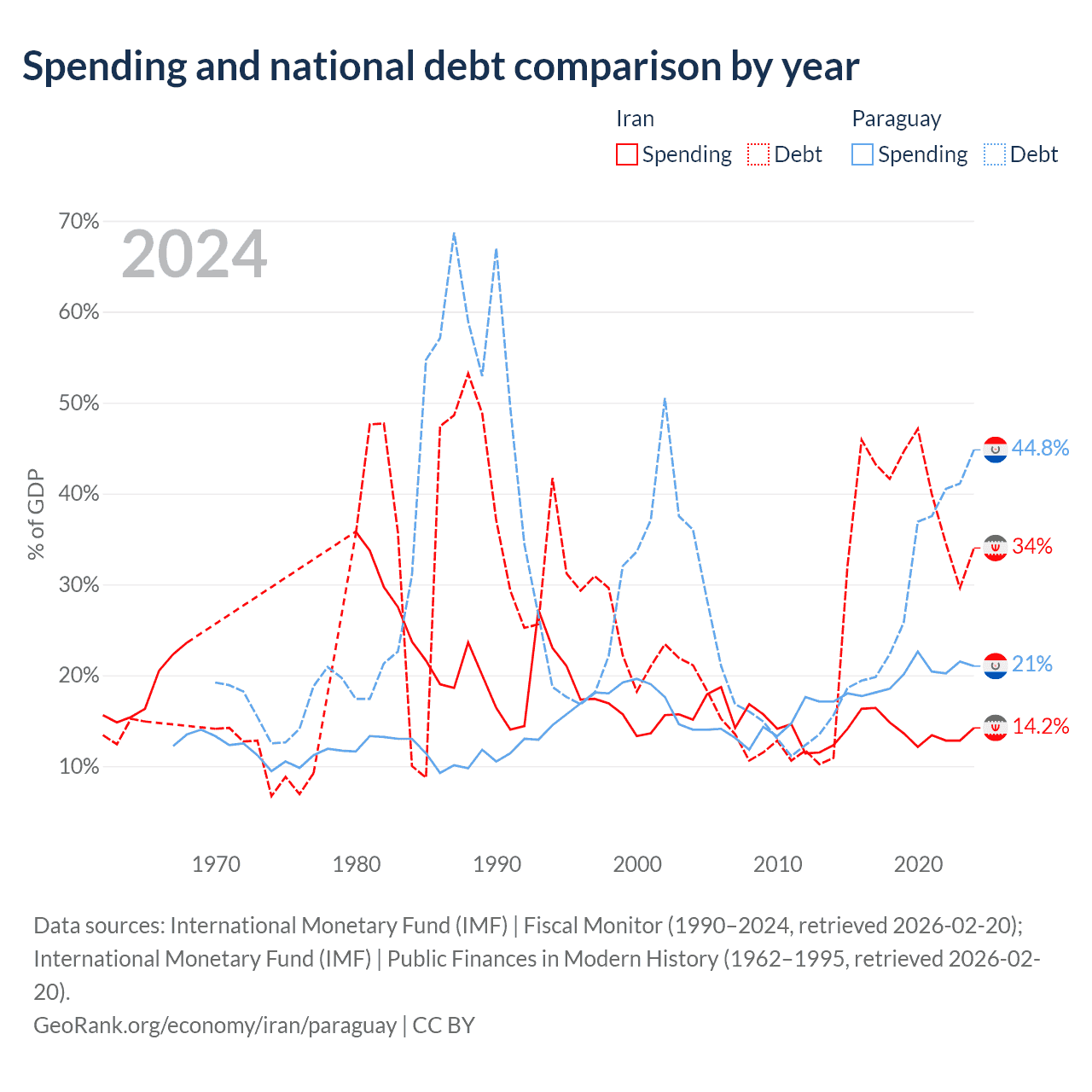 Iran has $162B in government debt (34% of GDP), compared to $19.9B (44.8% of GDP) in Paraguay.
