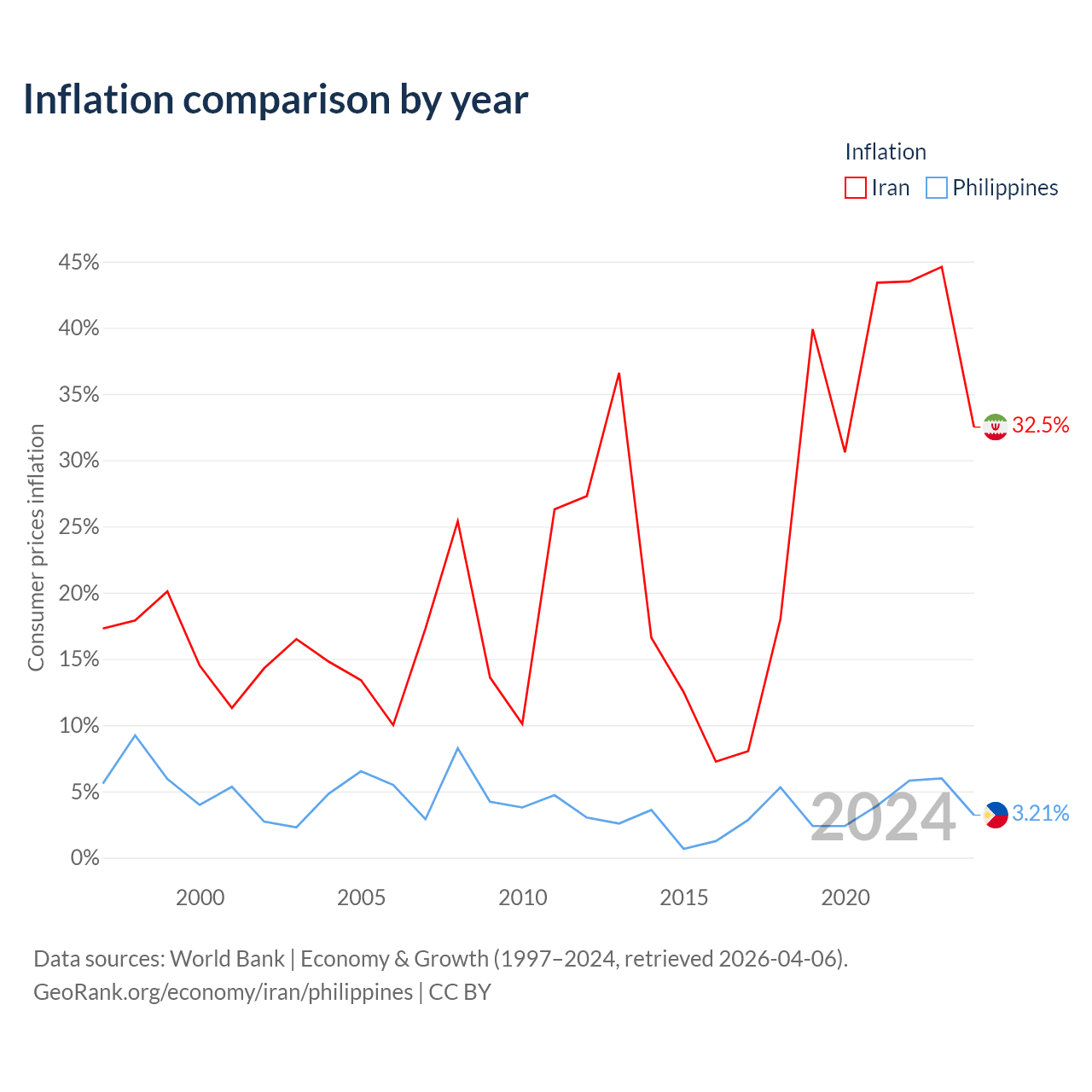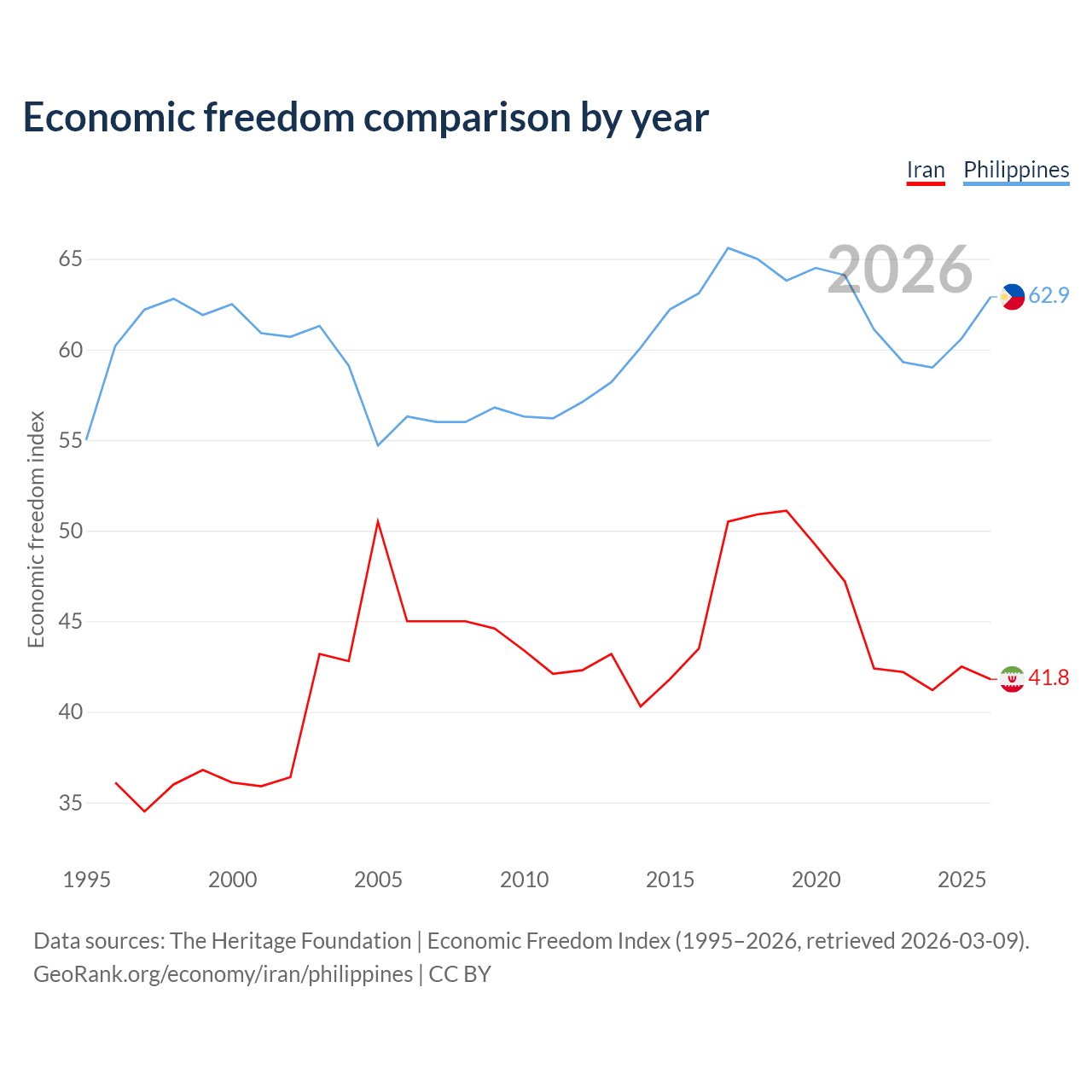 The Economic Freedom Index for Iran is 41.8, ranking 185/197, compared to 62.9 for the Philippines, ranking 85/197. The chart above displays a comparison of annual changes in economic freedom indexes.