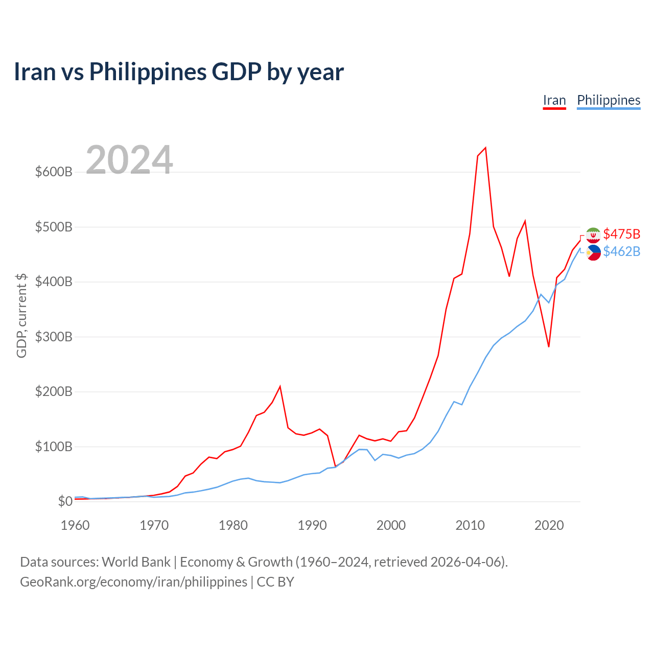 Iran has a GDP of $475B compared to $462B for the Philippines, ranking 34/197 and 35/197 by economy size, respectively.