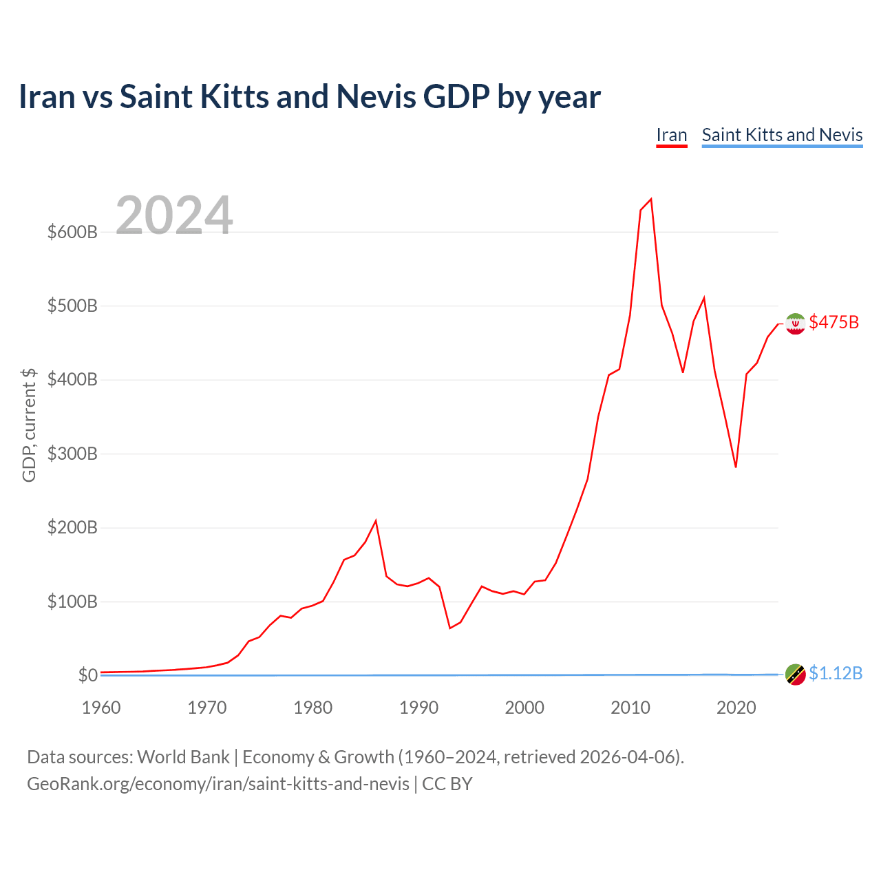 Iran has a GDP of $475B compared to $1.12B for Saint Kitts and Nevis, ranking 34/197 and 187/197 by economy size, respectively.