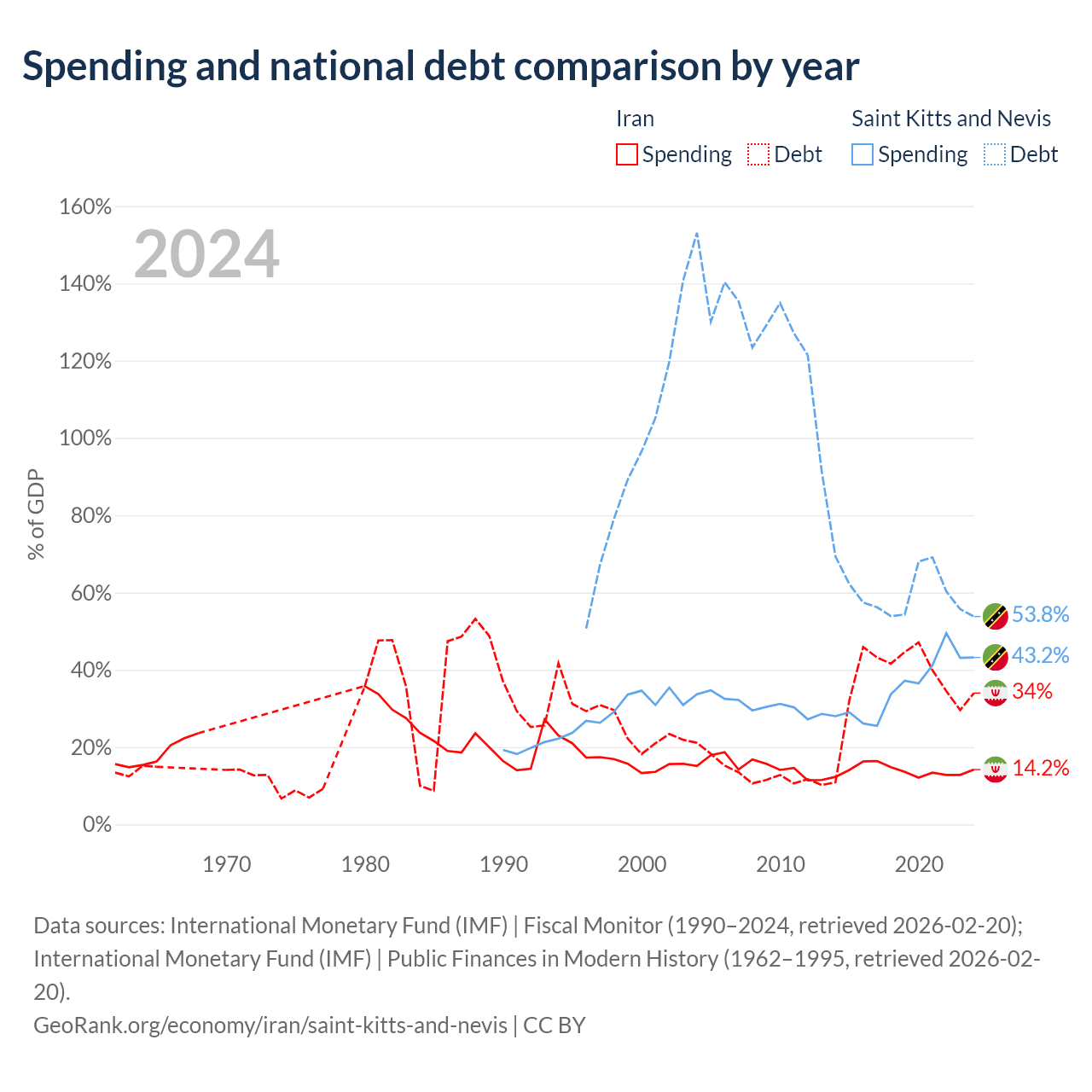 Iran has $162B in government debt (34% of GDP), compared to $604M (53.8% of GDP) in Saint Kitts and Nevis.