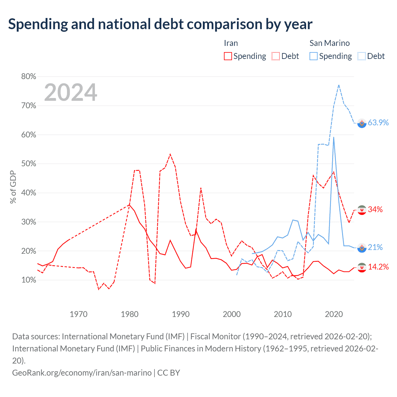 Iran has $162B in government debt (34% of GDP), compared to $1.39B (63.9% of GDP) in San Marino.