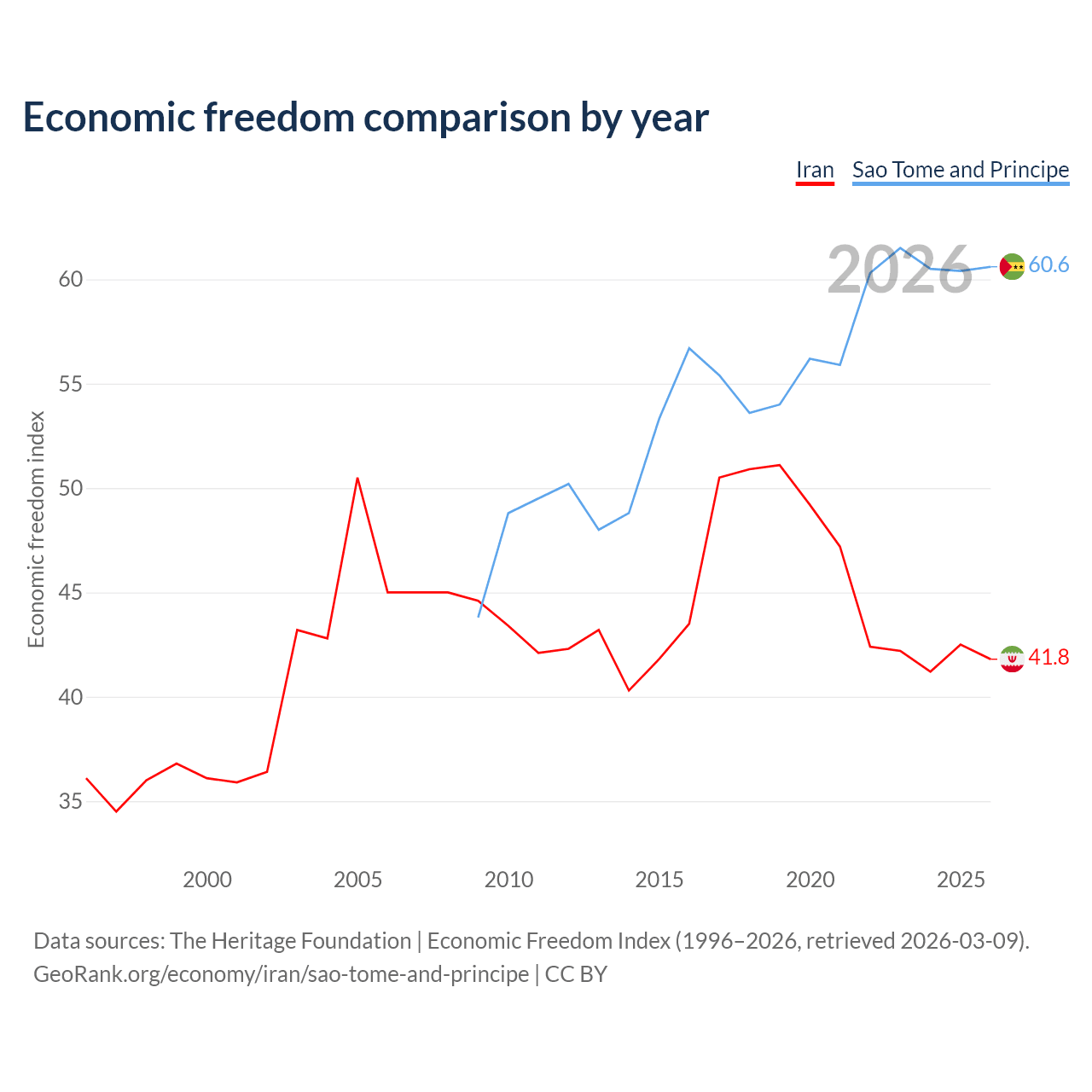 The Economic Freedom Index for Iran is 41.8, ranking 185/197, compared to 60.6 for Sao Tome and Principe, ranking 93/197. The chart above displays a comparison of annual changes in economic freedom indexes.