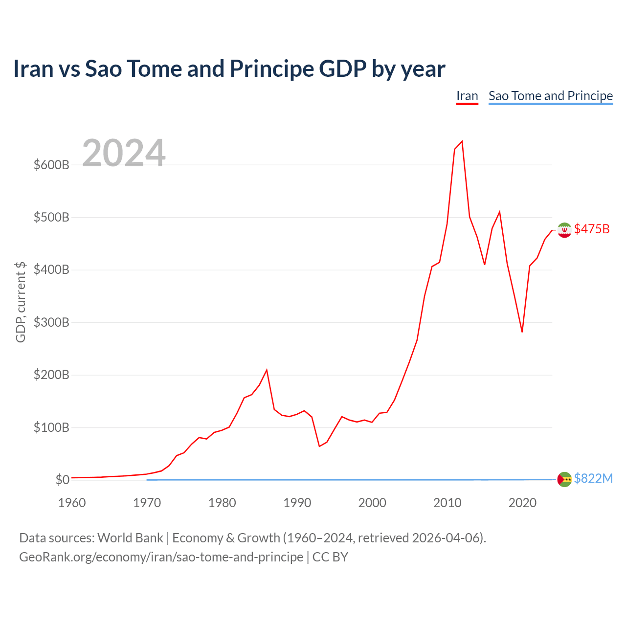 Iran has a GDP of $475B compared to $822M for Sao Tome and Principe, ranking 34/197 and 189/197 by economy size, respectively.