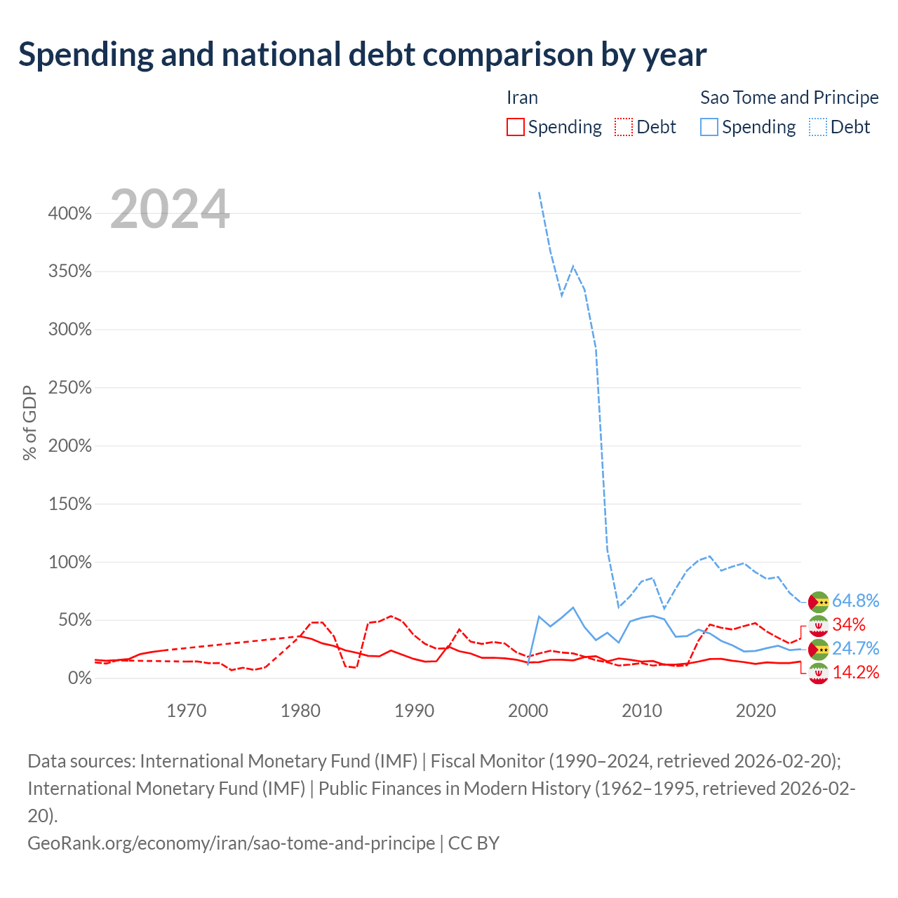 Iran has $162B in government debt (34% of GDP), compared to $533M (64.8% of GDP) in Sao Tome and Principe.