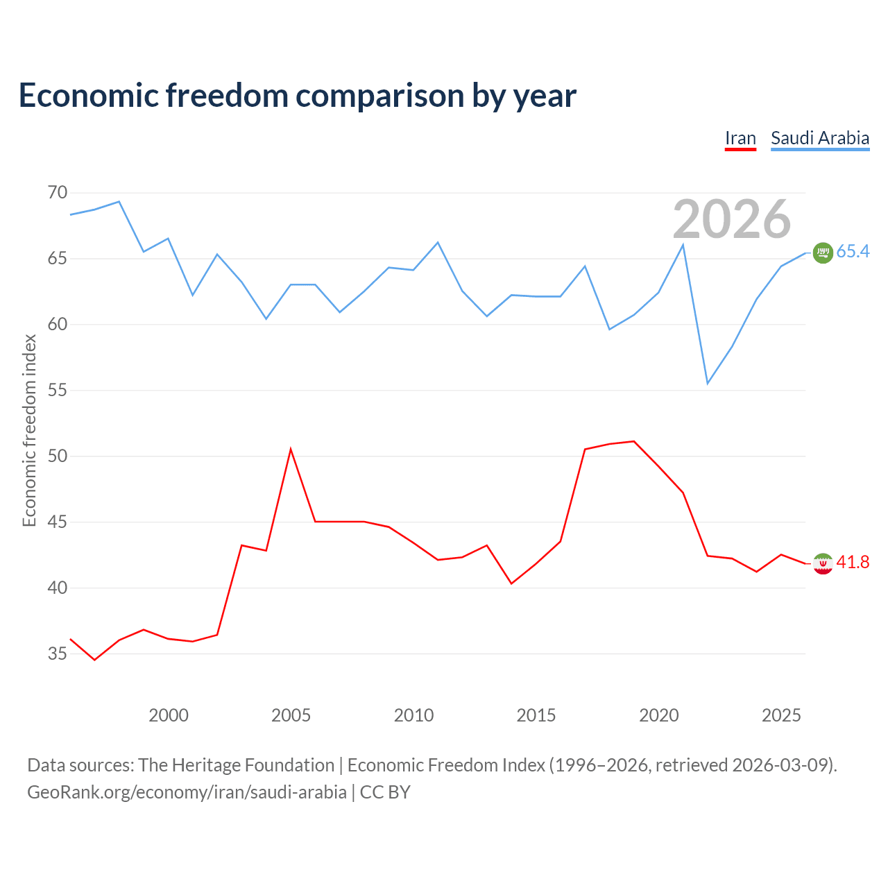The Economic Freedom Index for Iran is 41.8, ranking 185/197, compared to 65.4 for Saudi Arabia, ranking 65/197. The chart above displays a comparison of annual changes in economic freedom indexes.