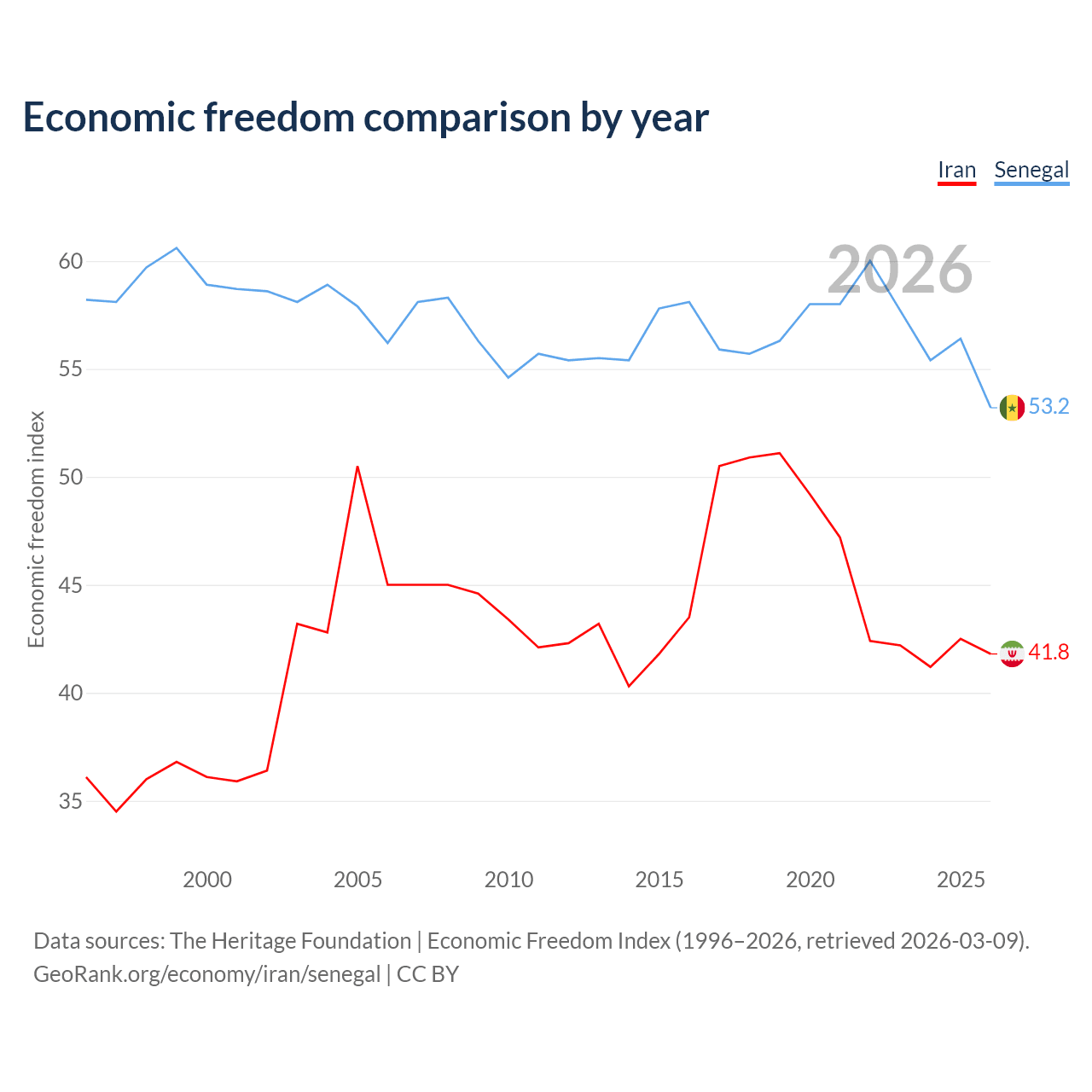The Economic Freedom Index for Iran is 41.8, ranking 185/197, compared to 53.2 for Senegal, ranking 140/197. The chart above displays a comparison of annual changes in economic freedom indexes.