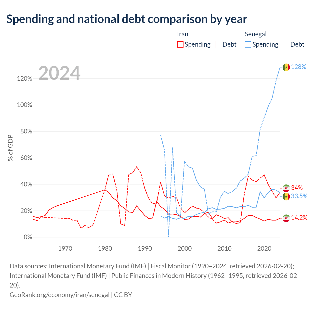 Iran has $162B in government debt (34% of GDP), compared to $42.1B (128.4% of GDP) in Senegal.