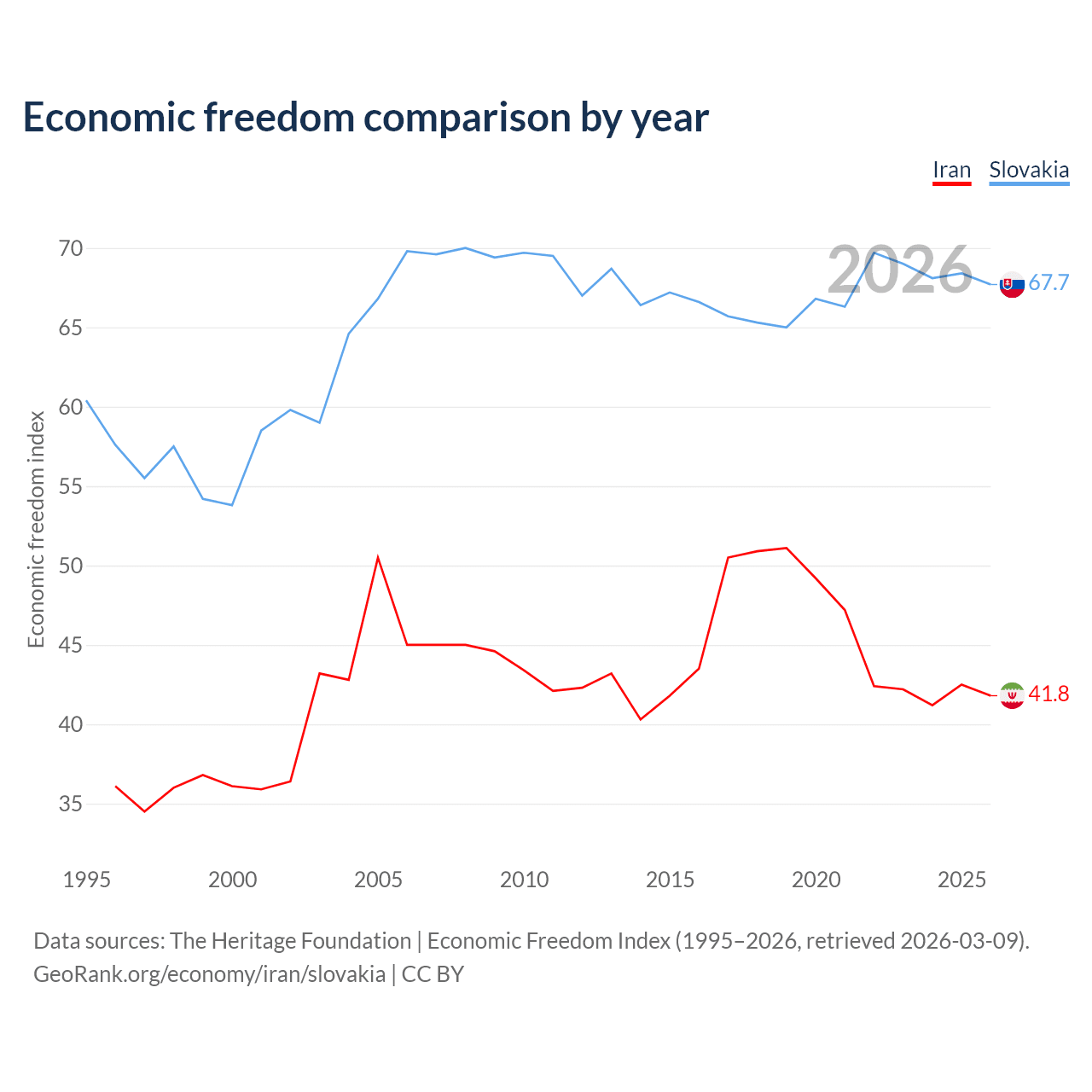 The Economic Freedom Index for Iran is 41.8, ranking 185/197, compared to 67.7 for Slovakia, ranking 54/197. The chart above displays a comparison of annual changes in economic freedom indexes.