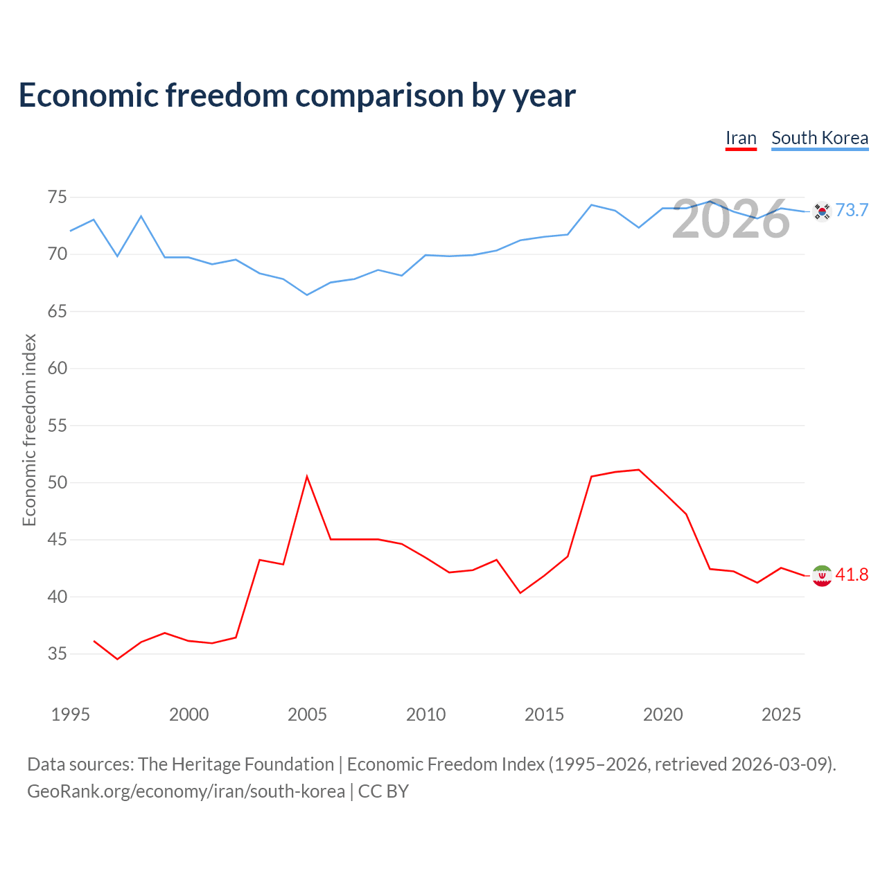 The Economic Freedom Index for Iran is 41.8, ranking 185/197, compared to 73.7 for South Korea, ranking 24/197. The chart above displays a comparison of annual changes in economic freedom indexes.