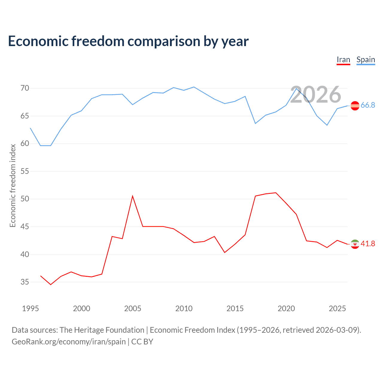 The Economic Freedom Index for Iran is 41.8, ranking 185/197, compared to 66.8 for Spain, ranking 59/197. The chart above displays a comparison of annual changes in economic freedom indexes.