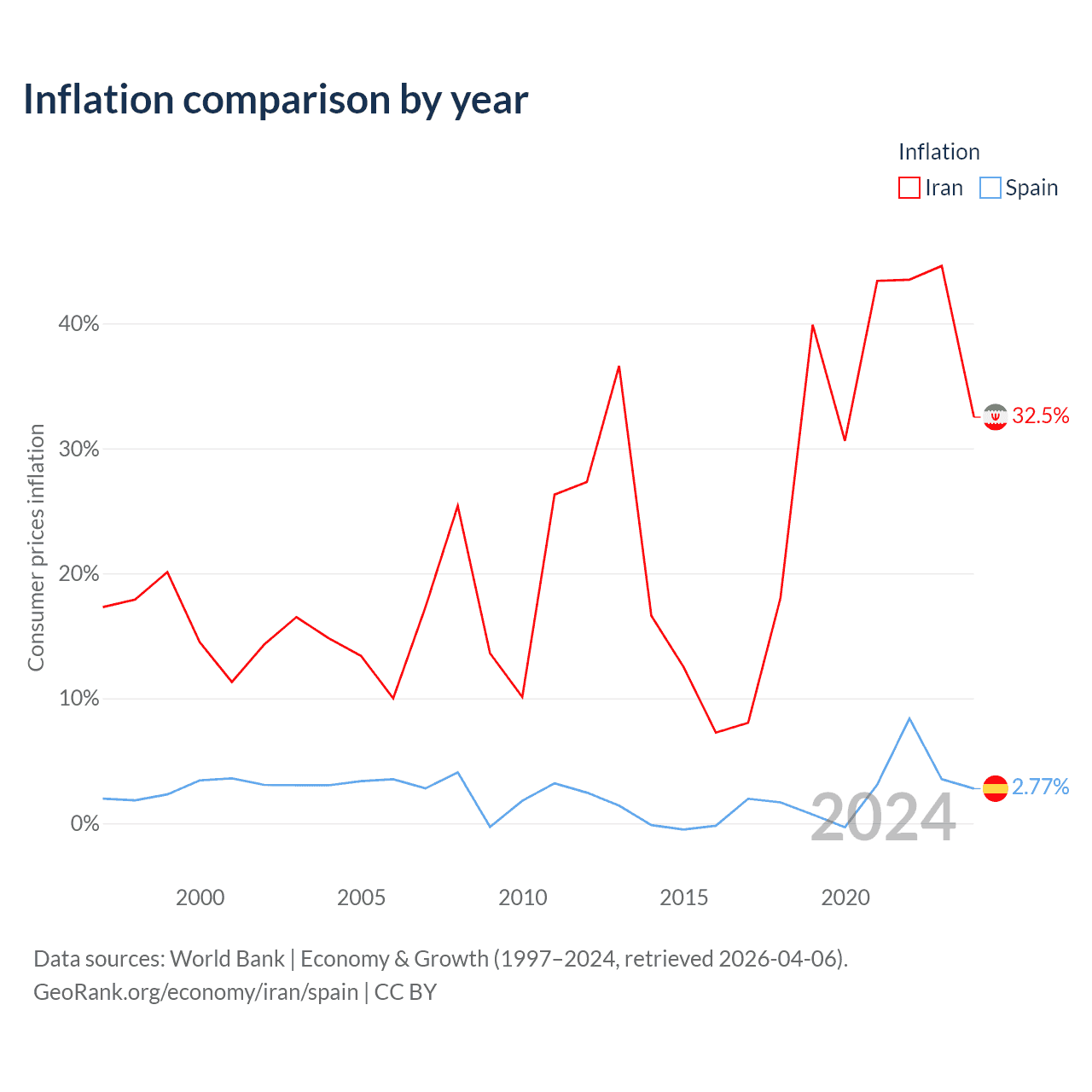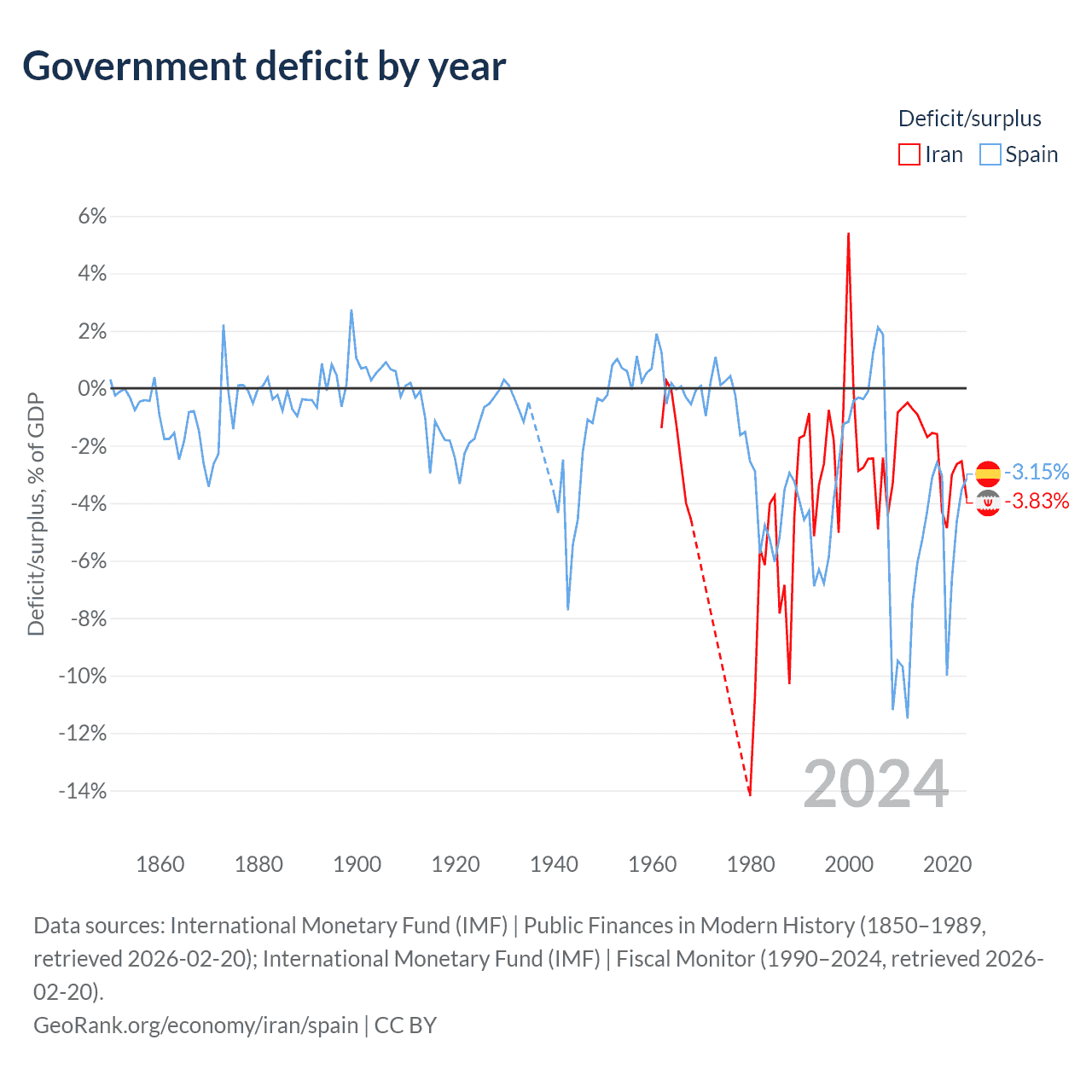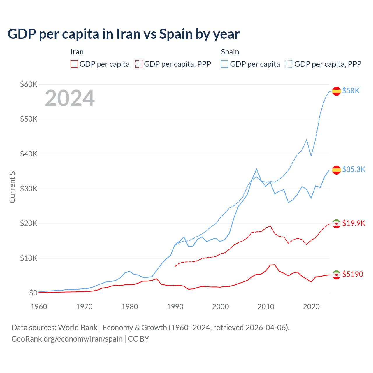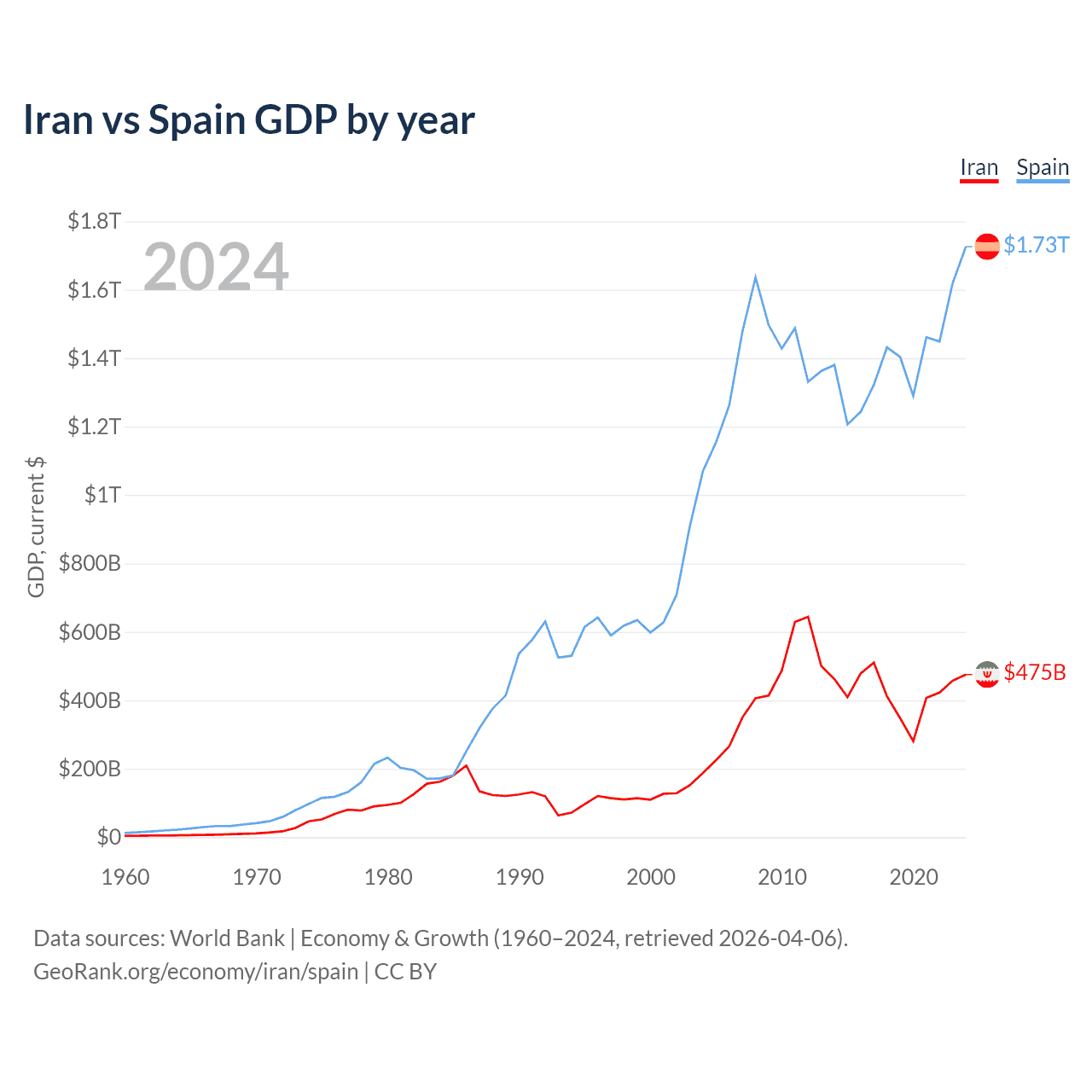 Iran has a GDP of $475B compared to $1.73T for Spain, ranking 34/197 and 15/197 by economy size, respectively.