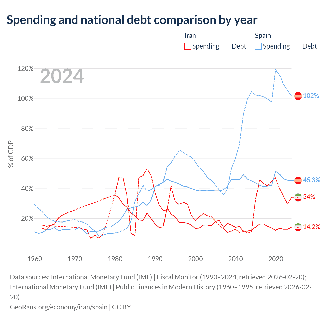 Iran has $162B in government debt (34% of GDP), compared to $1.75T (101.6% of GDP) in Spain.