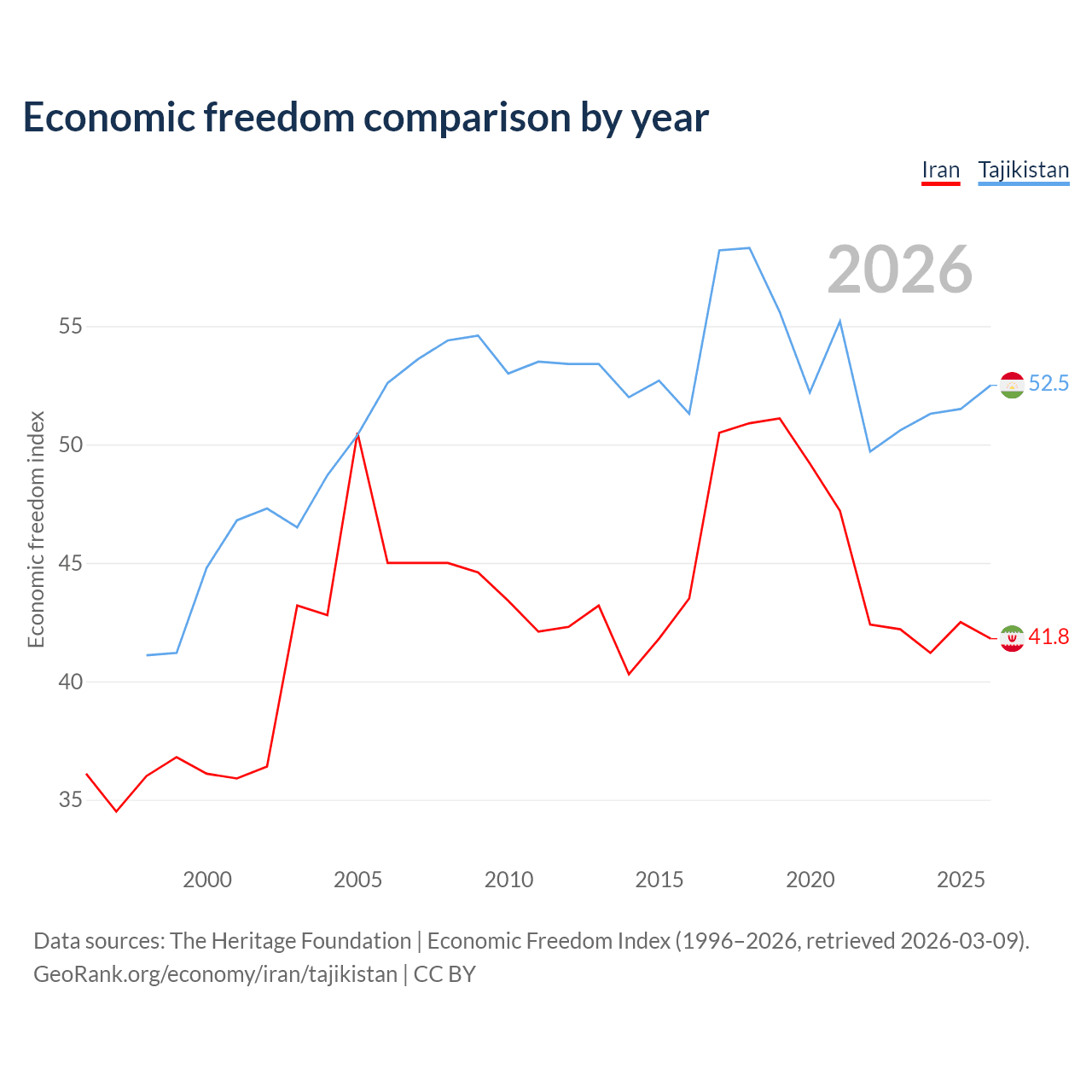 The Economic Freedom Index for Iran is 41.8, ranking 185/197, compared to 52.5 for Tajikistan, ranking 147/197. The chart above displays a comparison of annual changes in economic freedom indexes.
