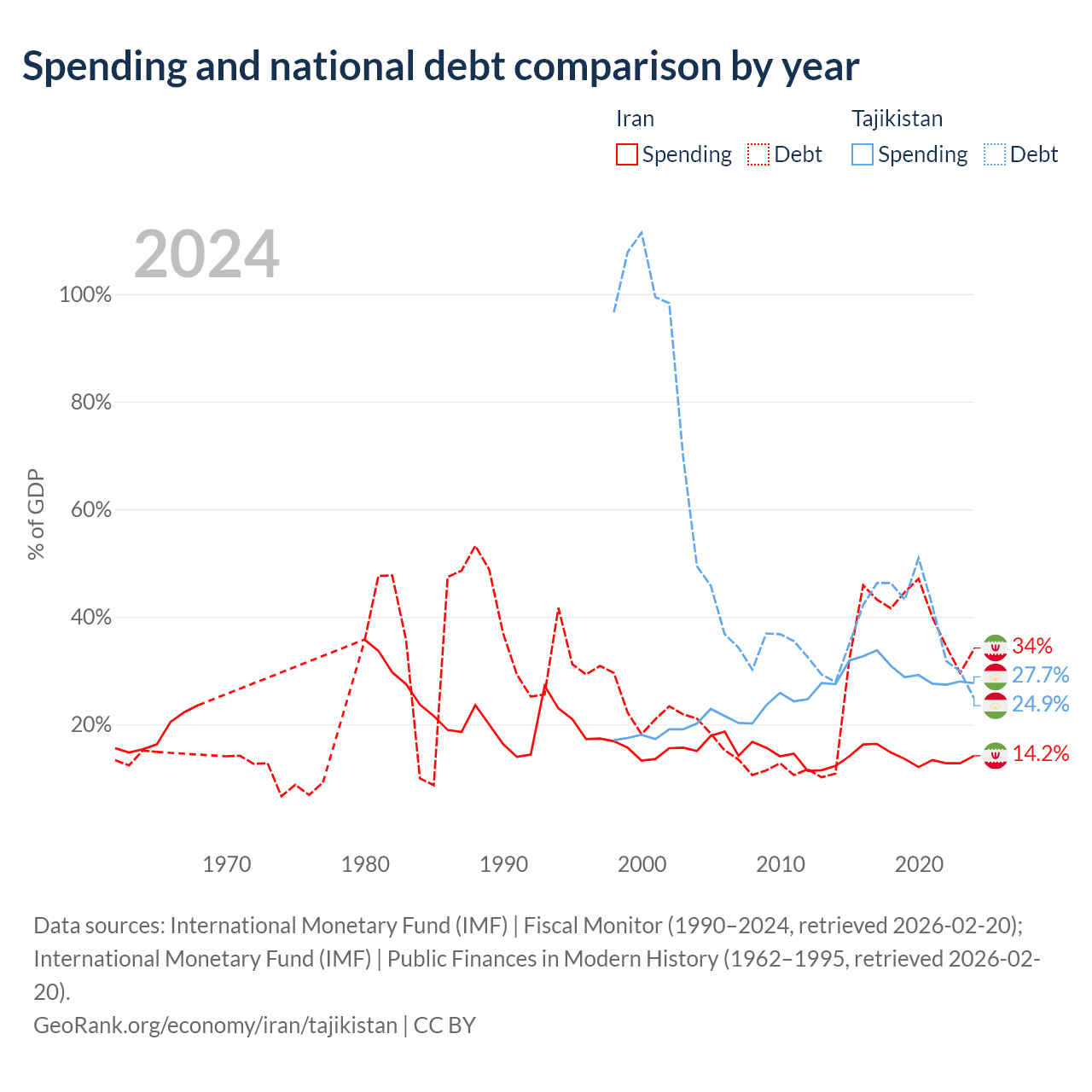 Iran has $162B in government debt (34% of GDP), compared to $3.54B (24.9% of GDP) in Tajikistan.