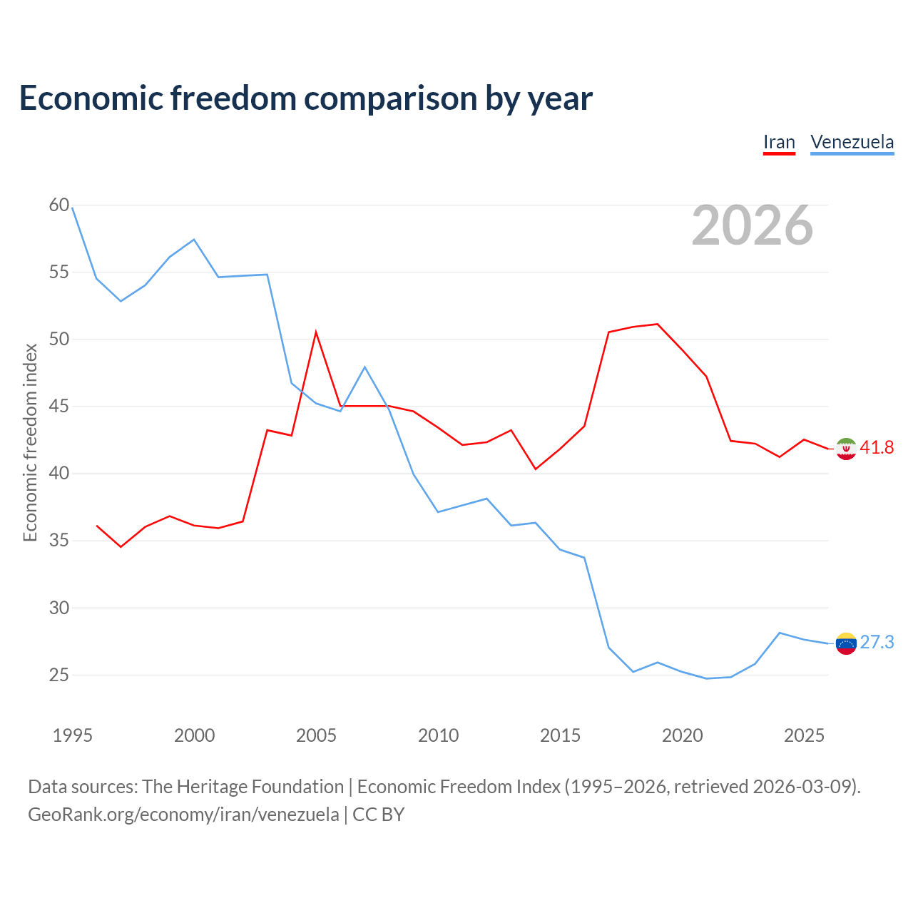 The Economic Freedom Index for Iran is 41.8, ranking 185/197, compared to 27.3 for Venezuela, ranking 194/197. The chart above displays a comparison of annual changes in economic freedom indexes.