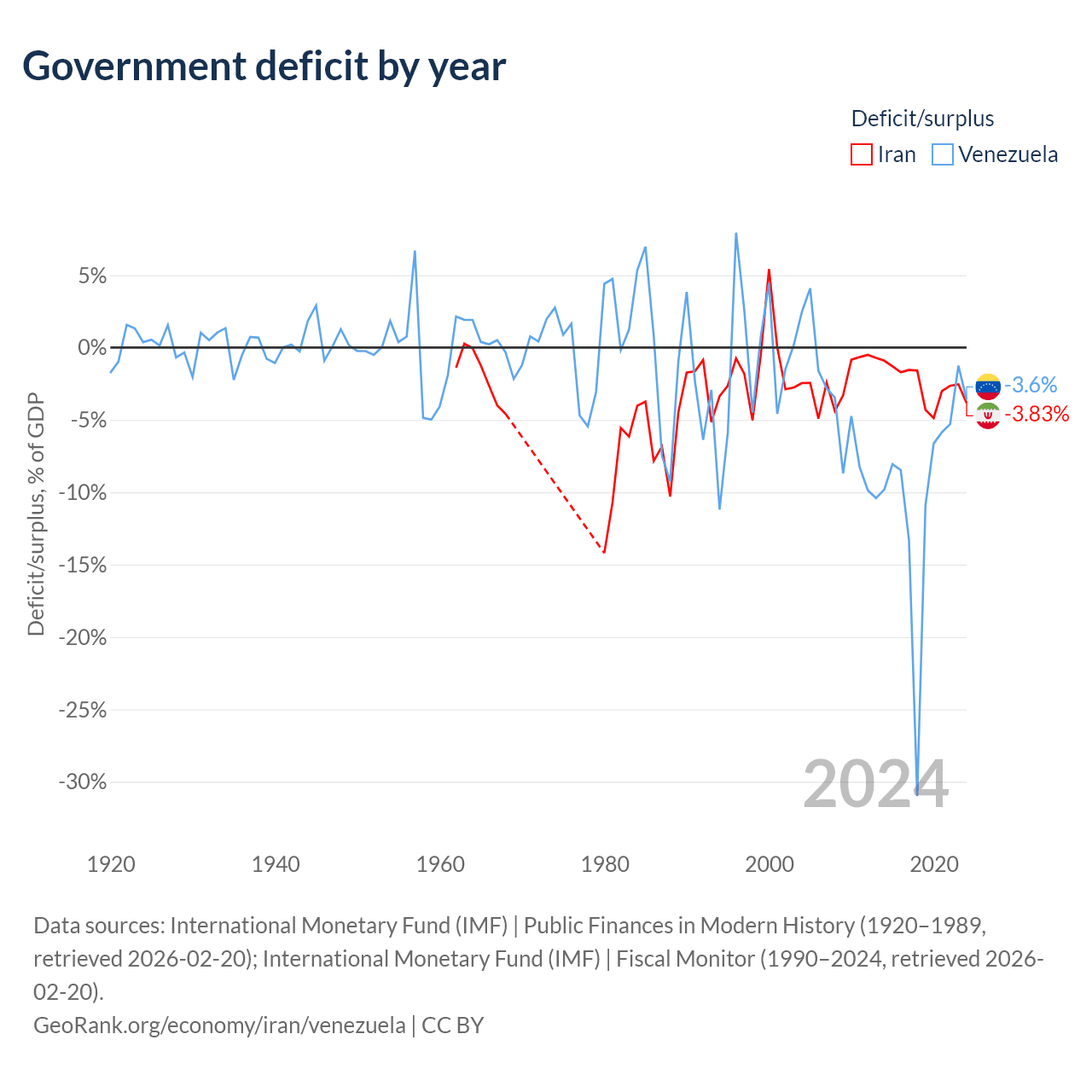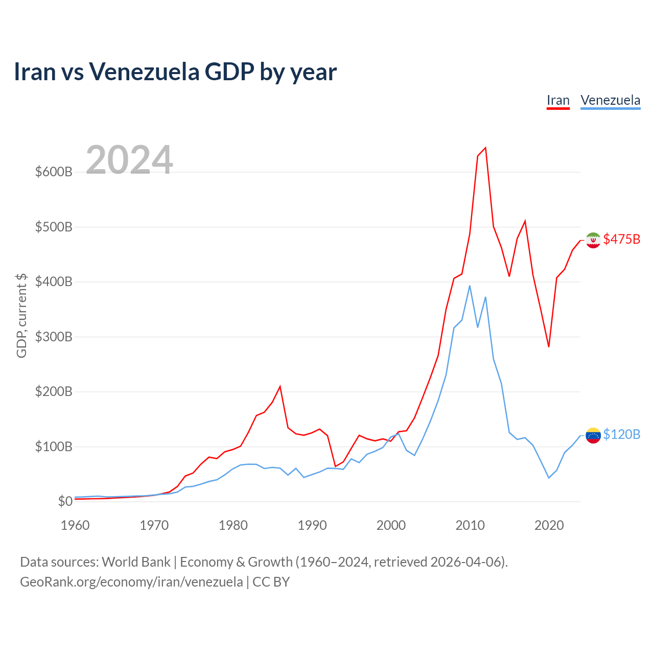 Iran has a GDP of $475B compared to $120B for Venezuela, ranking 34/197 and 65/197 by economy size, respectively.