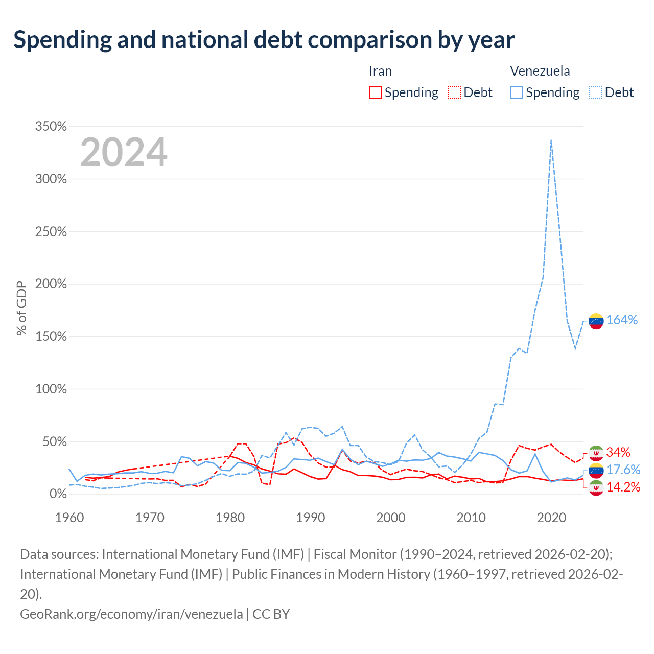 Iran has $162B in government debt (34% of GDP), compared to $197B (164.3% of GDP) in Venezuela.