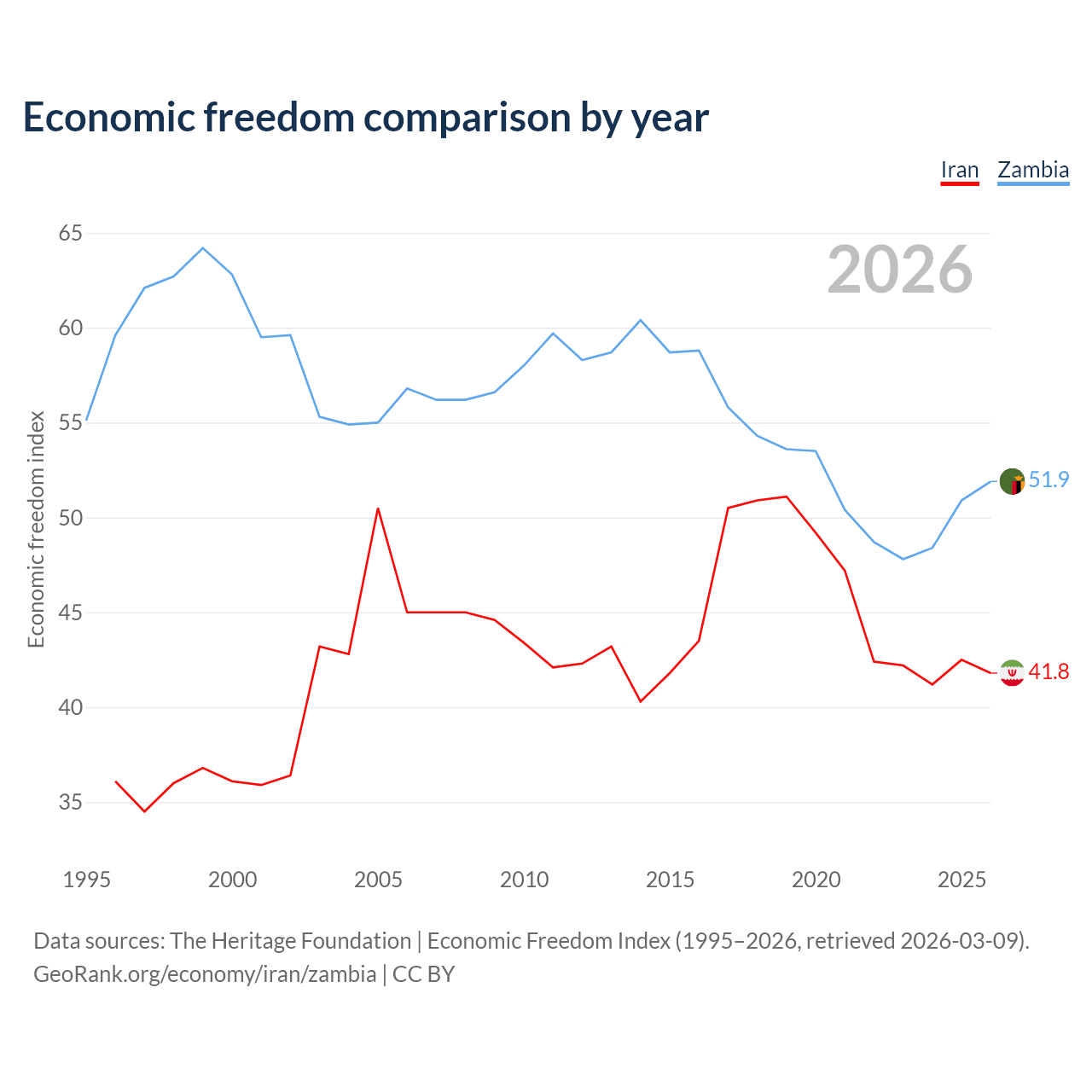 The Economic Freedom Index for Iran is 41.8, ranking 185/197, compared to 51.9 for Zambia, ranking 152/197. The chart above displays a comparison of annual changes in economic freedom indexes.