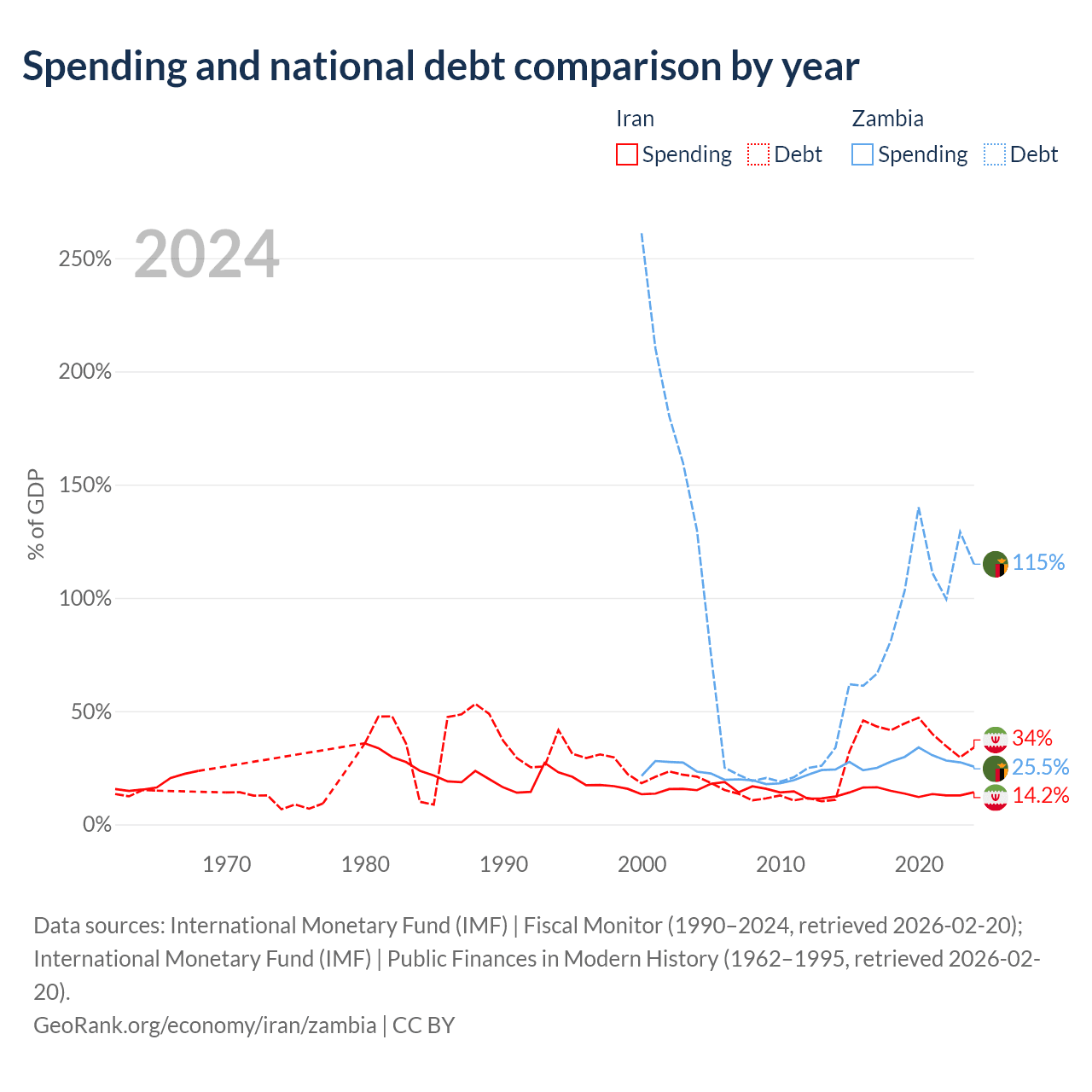 Iran has $162B in government debt (34% of GDP), compared to $29.1B (114.9% of GDP) in Zambia.