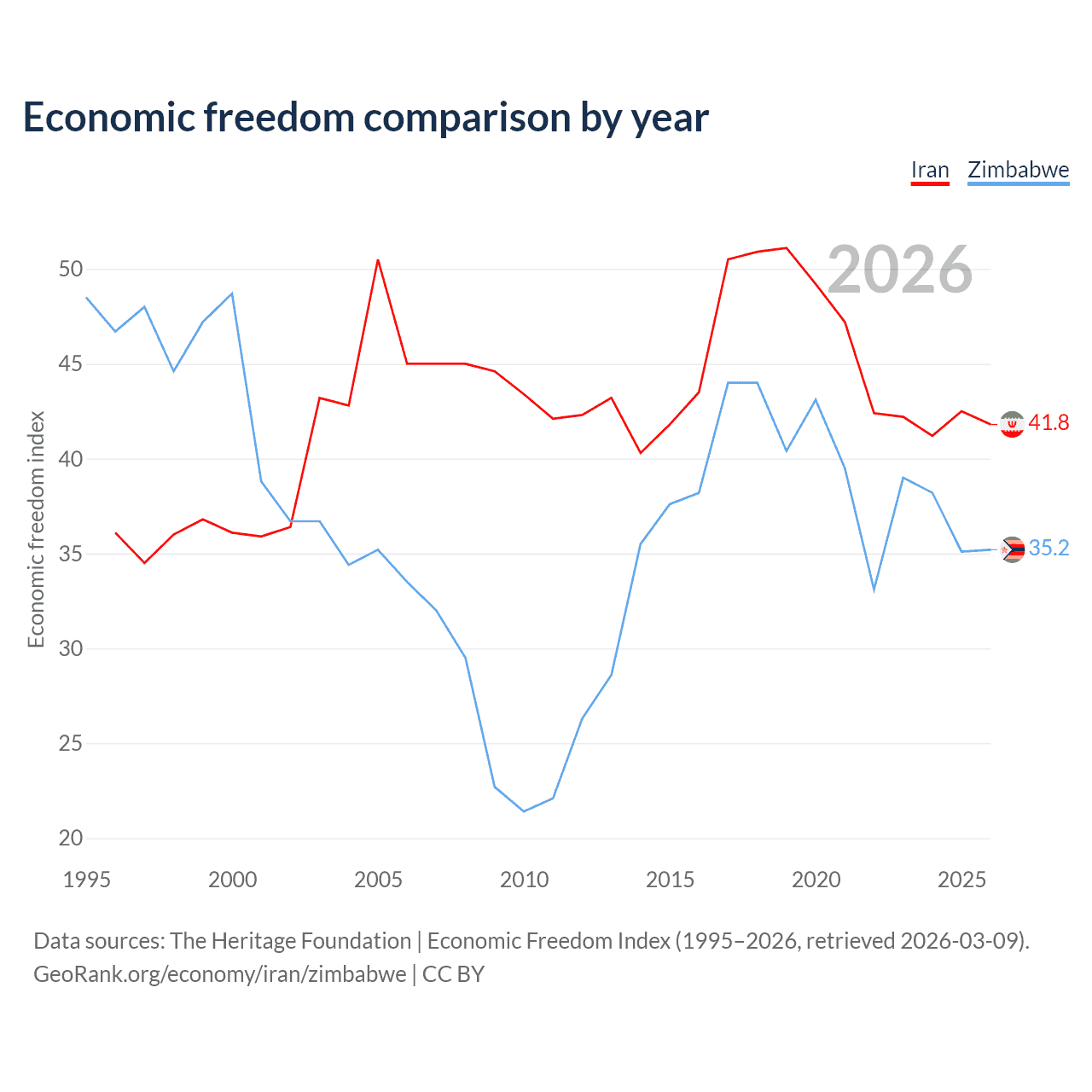 Data sources: The Heritage Foundation | Economic Freedom Index (1995–2026, retrieved 2026-03-09).