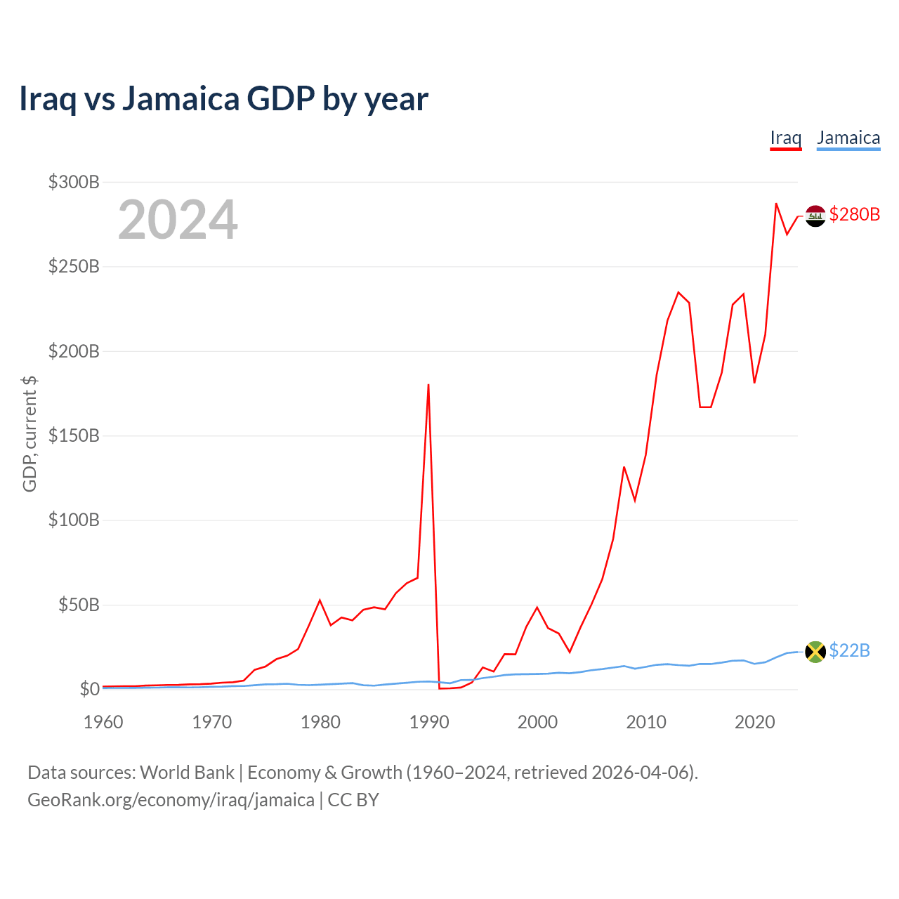 Iraq vs Jamaica GDP by year